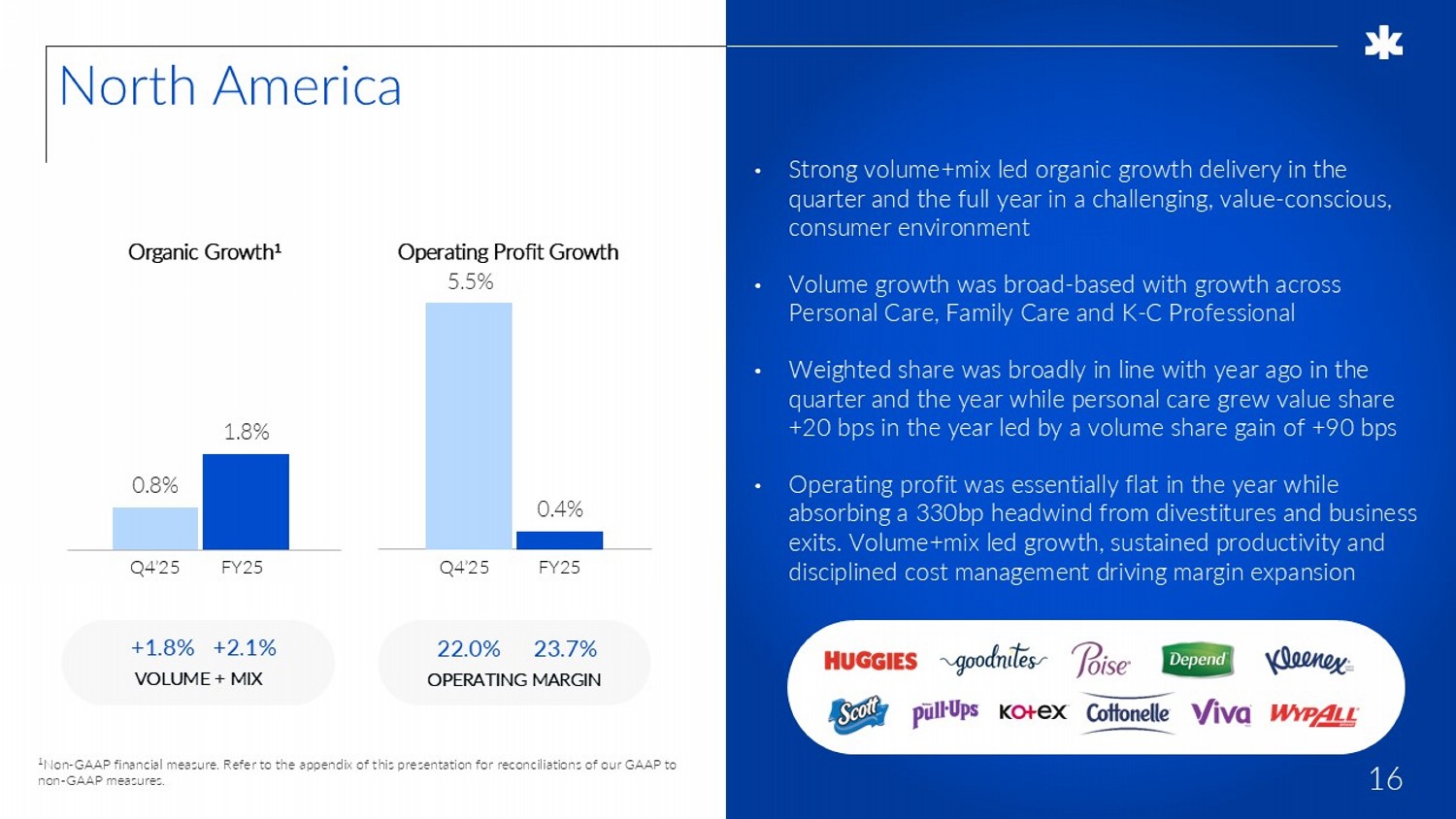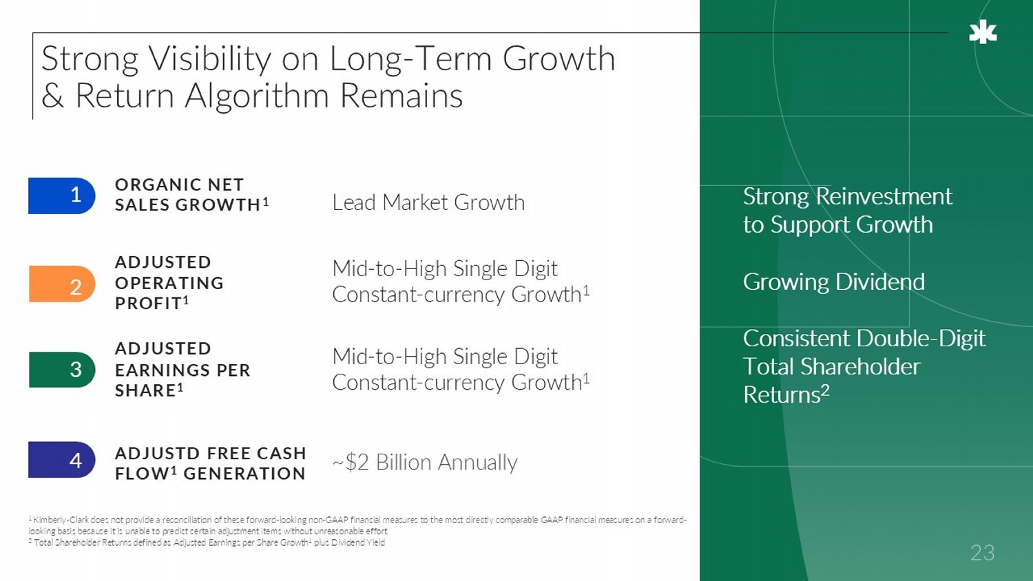 14.8% 16.6% 18 - 20% 2023 2025 Aspiration² + 180 bps 36.6% 37.3% 40.0% 2023 2025 Aspiration² + 70 bps + Performing While Transforming Strong progress across business fundamentals - 1.6% - 0.7% 1.0% 2.6% FY22 FY23 FY24 FY25 Volume + Mix Adjusted Gross Margin 1 14.4% 13.6% (80) bps Adjusted RSG&A as % of Net Sales 1 Adjusted Operating Margin 1 2023 2025 Steady and continuous progress in volume+mix led growth driven by consumer centric innovation and resonant brand campaigns One Supply Chain and efficiency - focused culture unleashing industry leading productivity to drive meaningful adjusted gross margin progress while funding investments in product differentiation and brand love Powering Care transformation delivering significant overhead efficiency, meaningful cost leverage Durable expansion in Adjusted Operating Profit margin through strong progress on fundamentals, on track to medium - term ambition 1 Non - GAAP financial measures. Refer to the appendix of this presentation for reconciliations of our GAAP to non - GAAP measures. 2 Kimberly - Clark does not provide a reconciliation of these forward - looking non - GAAP financial measures to the most directly compa rable GAAP financial measures on a forward - looking basis because it is unable to predict certain adjustment items without unreasonable effort.