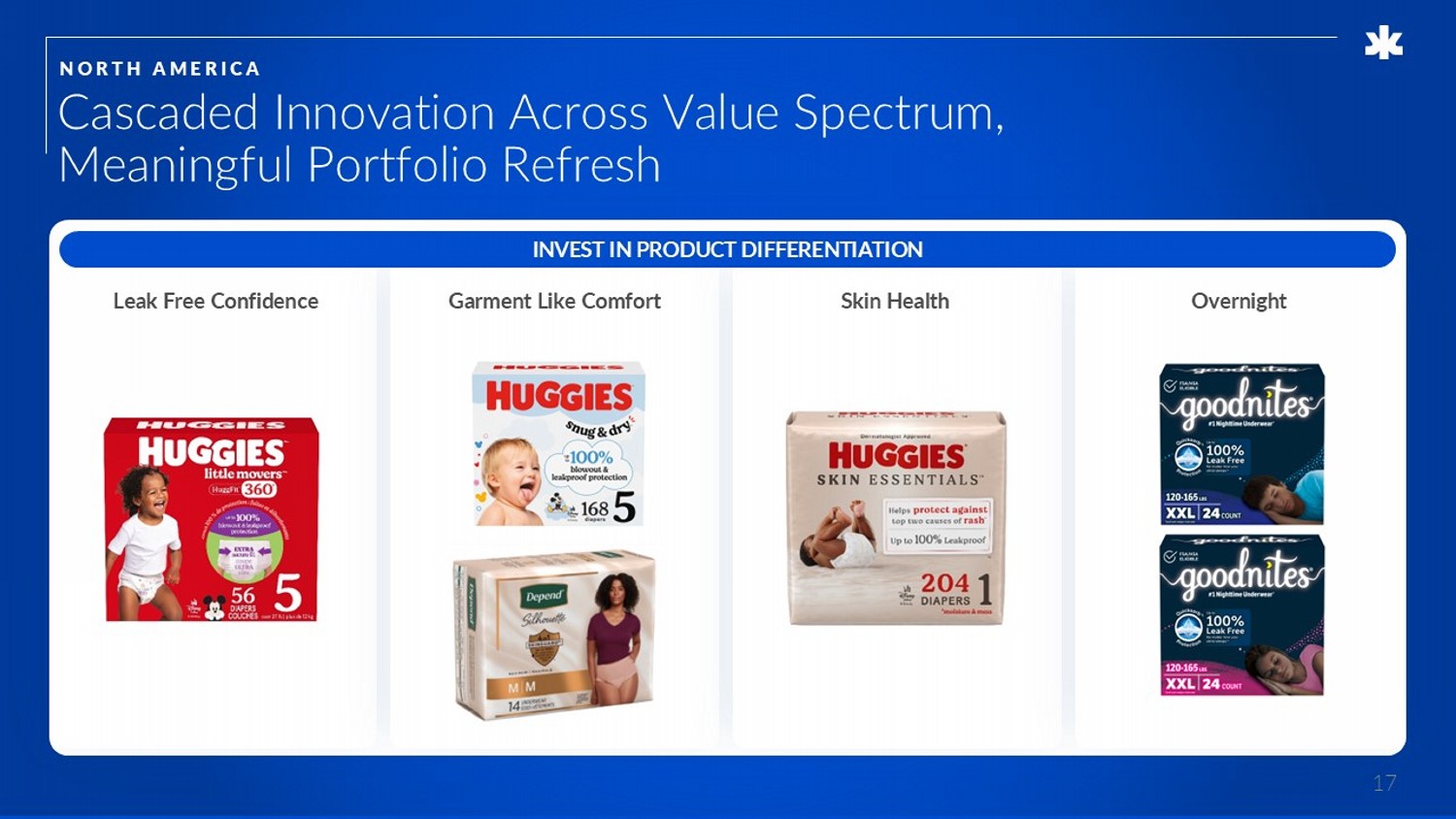 INVEST IN PRODUCT DIFFERENTIATION Leak Free Confidence Garment Like Comfort Skin Health Overnight Cascaded Innovation Across Value Spectrum, Meaningful Portfolio Refresh NORTH AMERICA 17