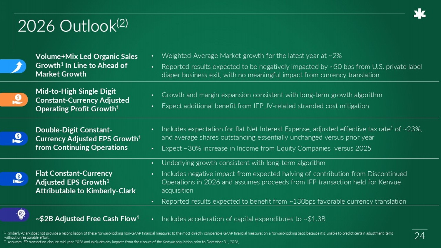24 2026 Outlook (2) 1 Kimberly - Clark does not provide a reconciliation of these forward - looking non - GAAP financial measures to the most directly comp arable GAAP financial measures on a forward - looking basis because it is unable to predict certain adjustment items without unreasonable effort. 2 Assumes IFP transaction closure mid - year 2026 and excludes any impacts from the closure of the Kenvue acquisition prior to Dec ember 31, 2026, • Weighted - Average Market growth for the latest year at ~2% • Reported results expected to be negatively impacted by ~50 bps from U.S. private label diaper business exit, with no meaningful impact from currency translation Volume+Mix Led Organic Sales Growth 1 In Line to Ahead of Market Growth • Growth and margin expansion consistent with long - term growth algorithm • Expect additional benefit from IFP JV - related stranded cost mitigation Mid - to - High Single Digit Constant - Currency Adjusted Operating Profit Growth 1 • Includes expectation for flat Net Interest Expense, adjusted effective tax rate 1 of ~23%, and average shares outstanding essentially unchanged versus prior year • Expect ~30% increase in Income from Equity Companies versus 2025 Double - Digit Constant - Currency Adjusted EPS Growth 1 from Continuing Operations • Underlying growth consistent with long - term algorithm • Includes negative impact from expected halving of contribution from Discontinued Operations in 2026 and assumes proceeds from IFP transaction held for Kenvue acquisition • Reported results expected to benefit from ~130bps favorable currency translation Flat Constant - Currency Adjusted EPS Growth 1 Attributable to Kimberly - Clark • Includes acceleration of capital expenditures to ~$1.3B ~$2B Adjusted Free Cash Flow 1