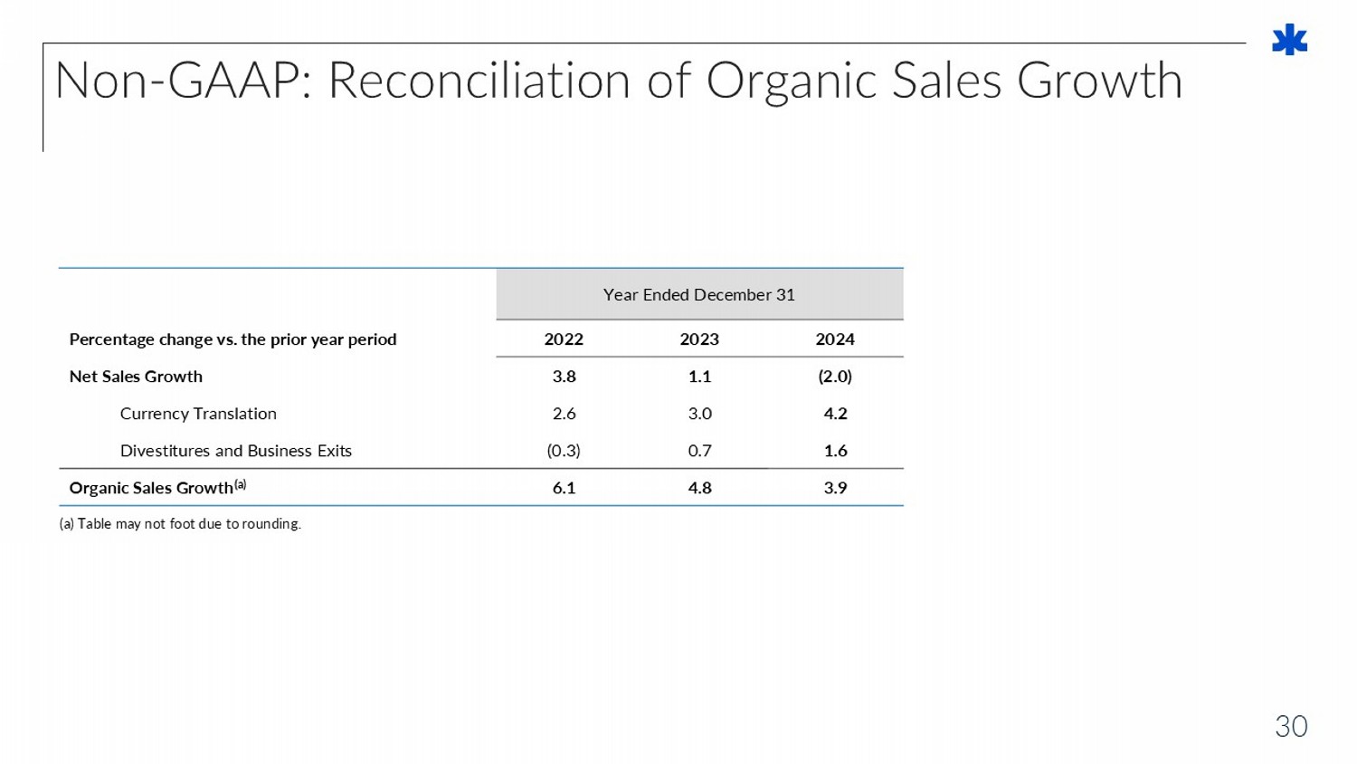 30 Non - GAAP: Reconciliation of Organic Sales Growth Year Ended December 31 2024 2023 2022 Percentage change vs. the prior year period (2.0) 1.1 3.8 Net Sales Growth 4.2 3.0 2.6 Currency Translation 1.6 0.7 (0.3) Divestitures and Business Exits 3.9 4.8 6.1 Organic Sales Growth (a) (a) Table may not foot due to rounding.