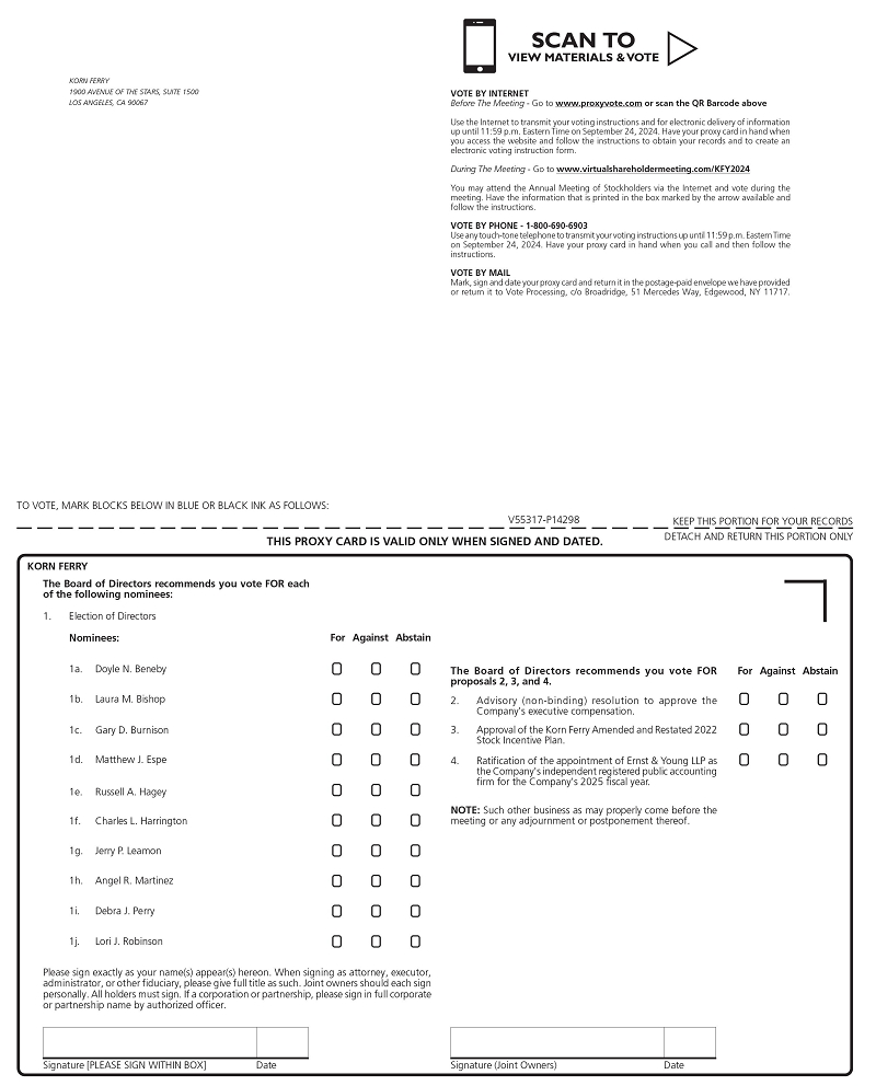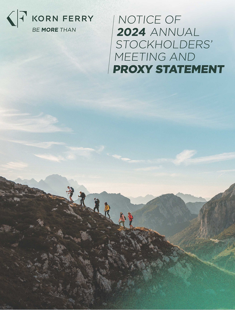 On behalf of the Board of Directors (the “Board”), senior management and more than 9,000 employees of Korn Ferry (the “Company,” “firm,” “we,” “its,” and “our”), it is my pleasure to invite you to our 2024 Annual Meeting of Stockholders on September 25, 2024, at 8:00 a.m. Pacific Time (the “Annual Meeting”).