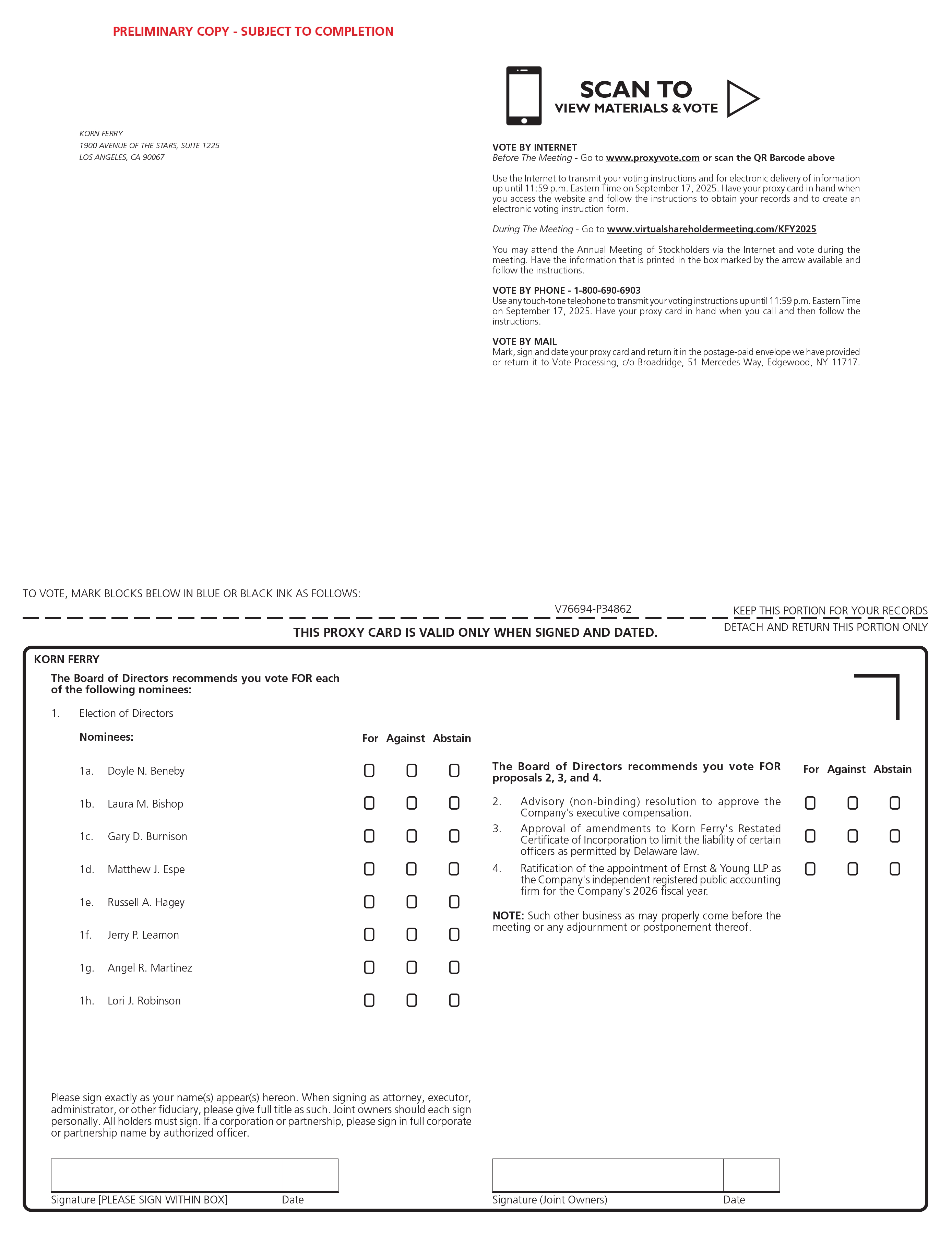 On behalf of the Board of Directors (the “Board”), senior management and more than 9,000 employees of Korn Ferry (the “Company,” “firm,” “we,” “its,” and “our”), we are delighted to invite you to our 2025 Annual Meeting of Stockholders on September 18, 2025, at 8:00 a.m. Pacific Time (the “Annual Meeting”).
