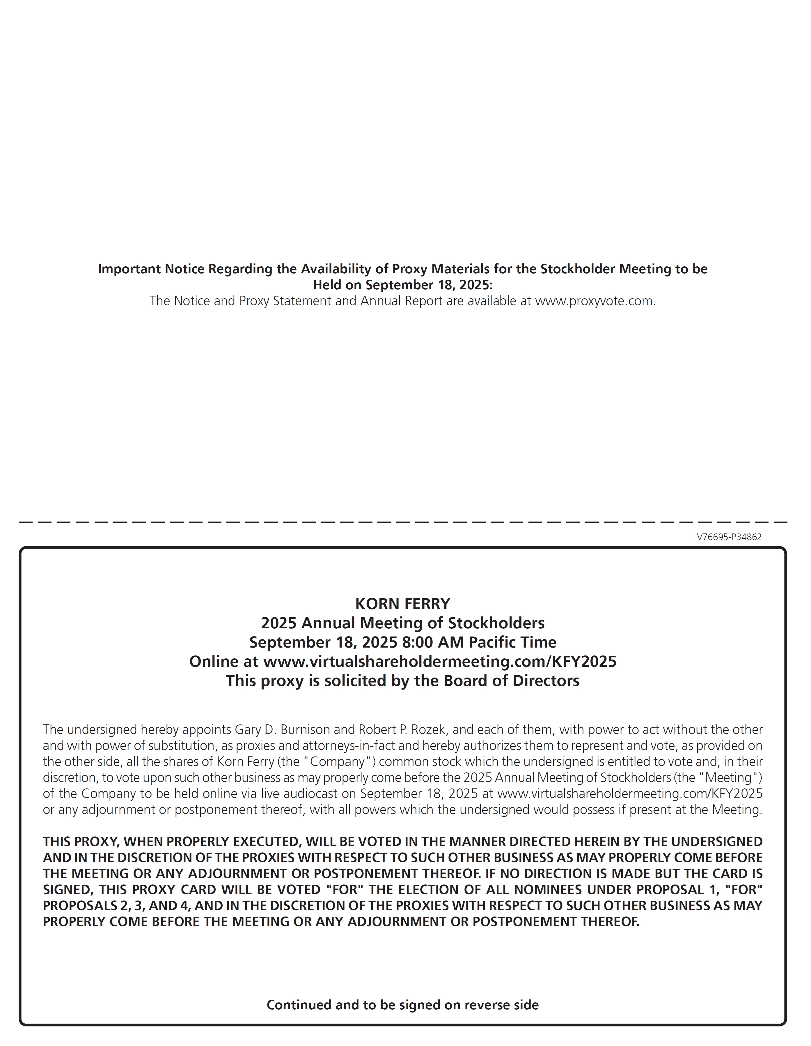 Meeting Disruption: In the event of a technical malfunction or situation that the chair of the Annual Meeting determines may affect the ability of the Annual Meeting to satisfy the requirements for a meeting of stockholders to be held by means of remote communication under the Delaware General Corporation Law, or that otherwise makes it advisable to adjourn the Annual Meeting, the chair of the Annual Meeting will convene the meeting at 9:00 a.m. Pacific Time on the date specified above and at the Company’s address at 1900 Avenue of the Stars, Suite 1225, Los Angeles, CA 90067, solely for the purpose of adjourning the Annual Meeting to reconvene at a date, time, and physical or virtual location announced by the chair of the Annual Meeting. Under either of the foregoing circumstances, we will post information regarding the announcement on the Investors page of the Company’s website at https://ir.kornferry.com.
