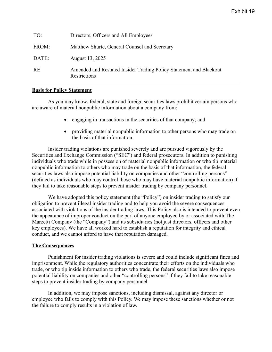 TO: Directors, Officers and All Employees FROM: Matthew Shurte, General Counsel and Secretary DATE: August 13, 2025 RE: Amended and Restated Insider Trading Policy Statement and Blackout Restrictions Basis for Policy Statement As you may know, federal, state and foreign securities laws prohibit certain persons who are aware of material nonpublic information about a company from: • engaging in transactions in the securities of that company; and • providing material nonpublic information to other persons who may trade on the basis of that information. Insider trading violations are punished severely and are pursued vigorously by the Securities and Exchange Commission (“SEC”) and federal prosecutors. In addition to punishing individuals who trade while in possession of material nonpublic information or who tip material nonpublic information to others who may trade on the basis of that information, the federal securities laws also impose potential liability on companies and other “controlling persons” (defined as individuals who may control those who may have material nonpublic information) if they fail to take reasonable steps to prevent insider trading by company personnel. We have adopted this policy statement (the “Policy”) on insider trading to satisfy our obligation to prevent illegal insider trading and to help you avoid the severe consequences associated with violations of the insider trading laws. This Policy also is intended to prevent even the appearance of improper conduct on the part of anyone employed by or associated with The Marzetti Company (the “Company”) and its subsidiaries (not just directors, officers and other key employees). We have all worked hard to establish a reputation for integrity and ethical conduct, and we cannot afford to have that reputation damaged. The Consequences Punishment for insider trading violations is severe and could include significant fines and imprisonment. While the regulatory authorities concentrate their efforts on the individuals who trade, or who tip inside information to others who trade, the federal securities laws also impose potential liability on companies and other “controlling persons” if they fail to take reasonable steps to prevent insider trading by company personnel. In addition, we may impose sanctions, including dismissal, against any director or employee who fails to comply with this Policy. We may impose these sanctions whether or not the failure to comply results in a violation of law. Exhibit 19