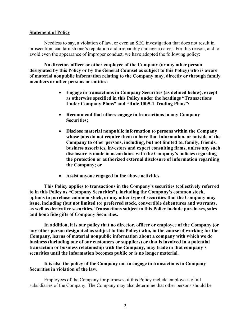 2 Statement of Policy Needless to say, a violation of law, or even an SEC investigation that does not result in prosecution, can tarnish one’s reputation and irreparably damage a career. For this reason, and to avoid even the appearance of improper conduct, we have adopted the following policy: No director, officer or other employee of the Company (or any other person designated by this Policy or by the General Counsel as subject to this Policy) who is aware of material nonpublic information relating to the Company may, directly or through family members or other persons or entities: • Engage in transactions in Company Securities (as defined below), except as otherwise specified in this Policy under the headings “Transactions Under Company Plans” and “Rule 10b5-1 Trading Plans”; • Recommend that others engage in transactions in any Company Securities; • Disclose material nonpublic information to persons within the Company whose jobs do not require them to have that information, or outside of the Company to other persons, including, but not limited to, family, friends, business associates, investors and expert consulting firms, unless any such disclosure is made in accordance with the Company’s policies regarding the protection or authorized external disclosure of information regarding the Company; or • Assist anyone engaged in the above activities. This Policy applies to transactions in the Company’s securities (collectively referred to in this Policy as “Company Securities”), including the Company’s common stock, options to purchase common stock, or any other type of securities that the Company may issue, including (but not limited to) preferred stock, convertible debentures and warrants, as well as derivative securities. Transactions subject to this Policy include purchases, sales and bona fide gifts of Company Securities. In addition, it is our policy that no director, officer or employee of the Company (or any other person designated as subject to this Policy) who, in the course of working for the Company, learns of material nonpublic information about a company with which we do business (including one of our customers or suppliers) or that is involved in a potential transaction or business relationship with the Company, may trade in that company’s securities until the information becomes public or is no longer material. It is also the policy of the Company not to engage in transactions in Company Securities in violation of the law. Employees of the Company for purposes of this Policy include employees of all subsidiaries of the Company. The Company may also determine that other persons should be