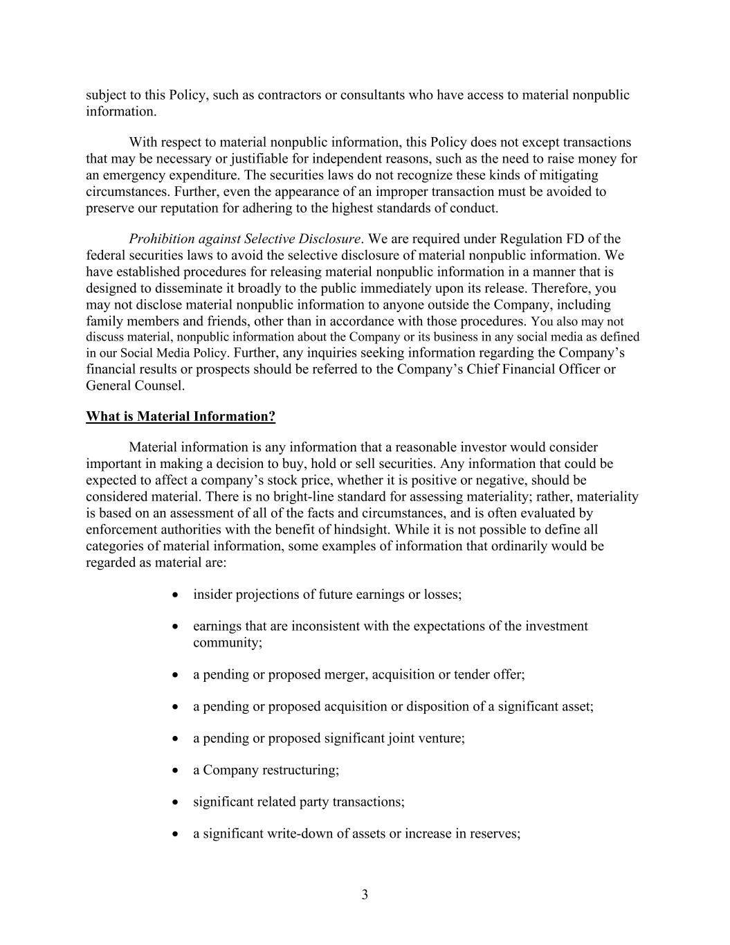 3 subject to this Policy, such as contractors or consultants who have access to material nonpublic information. With respect to material nonpublic information, this Policy does not except transactions that may be necessary or justifiable for independent reasons, such as the need to raise money for an emergency expenditure. The securities laws do not recognize these kinds of mitigating circumstances. Further, even the appearance of an improper transaction must be avoided to preserve our reputation for adhering to the highest standards of conduct. Prohibition against Selective Disclosure. We are required under Regulation FD of the federal securities laws to avoid the selective disclosure of material nonpublic information. We have established procedures for releasing material nonpublic information in a manner that is designed to disseminate it broadly to the public immediately upon its release. Therefore, you may not disclose material nonpublic information to anyone outside the Company, including family members and friends, other than in accordance with those procedures. You also may not discuss material, nonpublic information about the Company or its business in any social media as defined in our Social Media Policy. Further, any inquiries seeking information regarding the Company’s financial results or prospects should be referred to the Company’s Chief Financial Officer or General Counsel. What is Material Information? Material information is any information that a reasonable investor would consider important in making a decision to buy, hold or sell securities. Any information that could be expected to affect a company’s stock price, whether it is positive or negative, should be considered material. There is no bright-line standard for assessing materiality; rather, materiality is based on an assessment of all of the facts and circumstances, and is often evaluated by enforcement authorities with the benefit of hindsight. While it is not possible to define all categories of material information, some examples of information that ordinarily would be regarded as material are: • insider projections of future earnings or losses; • earnings that are inconsistent with the expectations of the investment community; • a pending or proposed merger, acquisition or tender offer; • a pending or proposed acquisition or disposition of a significant asset; • a pending or proposed significant joint venture; • a Company restructuring; • significant related party transactions; • a significant write-down of assets or increase in reserves;