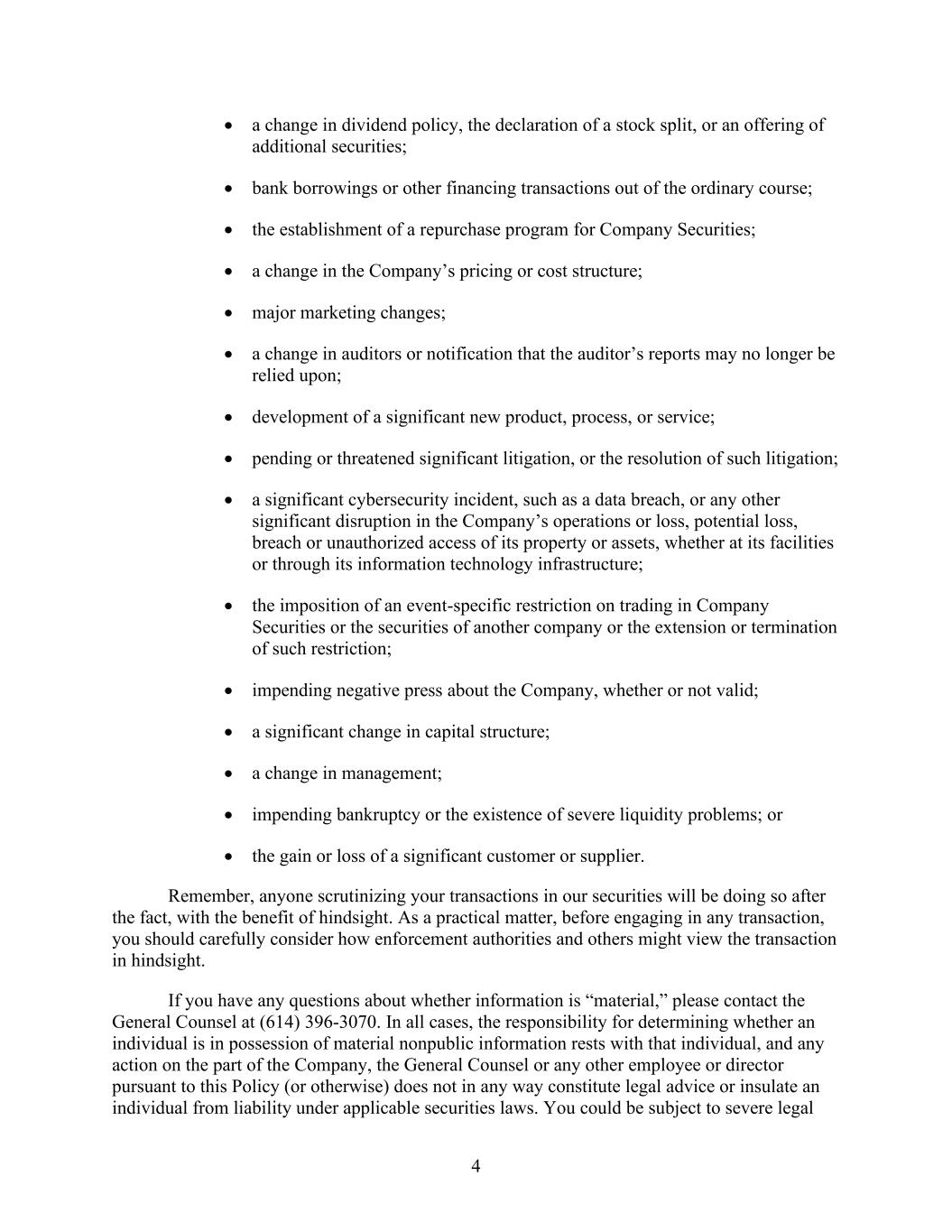4 • a change in dividend policy, the declaration of a stock split, or an offering of additional securities; • bank borrowings or other financing transactions out of the ordinary course; • the establishment of a repurchase program for Company Securities; • a change in the Company’s pricing or cost structure; • major marketing changes; • a change in auditors or notification that the auditor’s reports may no longer be relied upon; • development of a significant new product, process, or service; • pending or threatened significant litigation, or the resolution of such litigation; • a significant cybersecurity incident, such as a data breach, or any other significant disruption in the Company’s operations or loss, potential loss, breach or unauthorized access of its property or assets, whether at its facilities or through its information technology infrastructure; • the imposition of an event-specific restriction on trading in Company Securities or the securities of another company or the extension or termination of such restriction; • impending negative press about the Company, whether or not valid; • a significant change in capital structure; • a change in management; • impending bankruptcy or the existence of severe liquidity problems; or • the gain or loss of a significant customer or supplier. Remember, anyone scrutinizing your transactions in our securities will be doing so after the fact, with the benefit of hindsight. As a practical matter, before engaging in any transaction, you should carefully consider how enforcement authorities and others might view the transaction in hindsight. If you have any questions about whether information is “material,” please contact the General Counsel at (614) 396-3070. In all cases, the responsibility for determining whether an individual is in possession of material nonpublic information rests with that individual, and any action on the part of the Company, the General Counsel or any other employee or director pursuant to this Policy (or otherwise) does not in any way constitute legal advice or insulate an individual from liability under applicable securities laws. You could be subject to severe legal