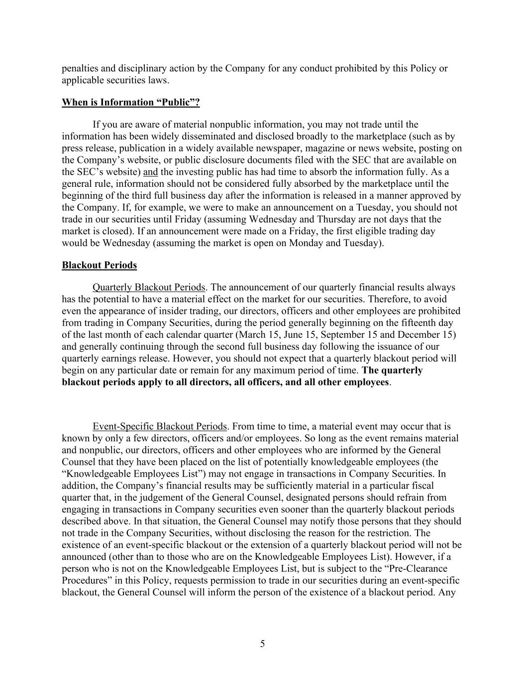 5 penalties and disciplinary action by the Company for any conduct prohibited by this Policy or applicable securities laws. When is Information “Public”? If you are aware of material nonpublic information, you may not trade until the information has been widely disseminated and disclosed broadly to the marketplace (such as by press release, publication in a widely available newspaper, magazine or news website, posting on the Company’s website, or public disclosure documents filed with the SEC that are available on the SEC’s website) and the investing public has had time to absorb the information fully. As a general rule, information should not be considered fully absorbed by the marketplace until the beginning of the third full business day after the information is released in a manner approved by the Company. If, for example, we were to make an announcement on a Tuesday, you should not trade in our securities until Friday (assuming Wednesday and Thursday are not days that the market is closed). If an announcement were made on a Friday, the first eligible trading day would be Wednesday (assuming the market is open on Monday and Tuesday). Blackout Periods Quarterly Blackout Periods. The announcement of our quarterly financial results always has the potential to have a material effect on the market for our securities. Therefore, to avoid even the appearance of insider trading, our directors, officers and other employees are prohibited from trading in Company Securities, during the period generally beginning on the fifteenth day of the last month of each calendar quarter (March 15, June 15, September 15 and December 15) and generally continuing through the second full business day following the issuance of our quarterly earnings release. However, you should not expect that a quarterly blackout period will begin on any particular date or remain for any maximum period of time. The quarterly blackout periods apply to all directors, all officers, and all other employees. Event-Specific Blackout Periods. From time to time, a material event may occur that is known by only a few directors, officers and/or employees. So long as the event remains material and nonpublic, our directors, officers and other employees who are informed by the General Counsel that they have been placed on the list of potentially knowledgeable employees (the “Knowledgeable Employees List”) may not engage in transactions in Company Securities. In addition, the Company’s financial results may be sufficiently material in a particular fiscal quarter that, in the judgement of the General Counsel, designated persons should refrain from engaging in transactions in Company securities even sooner than the quarterly blackout periods described above. In that situation, the General Counsel may notify those persons that they should not trade in the Company Securities, without disclosing the reason for the restriction. The existence of an event-specific blackout or the extension of a quarterly blackout period will not be announced (other than to those who are on the Knowledgeable Employees List). However, if a person who is not on the Knowledgeable Employees List, but is subject to the “Pre-Clearance Procedures” in this Policy, requests permission to trade in our securities during an event-specific blackout, the General Counsel will inform the person of the existence of a blackout period. Any