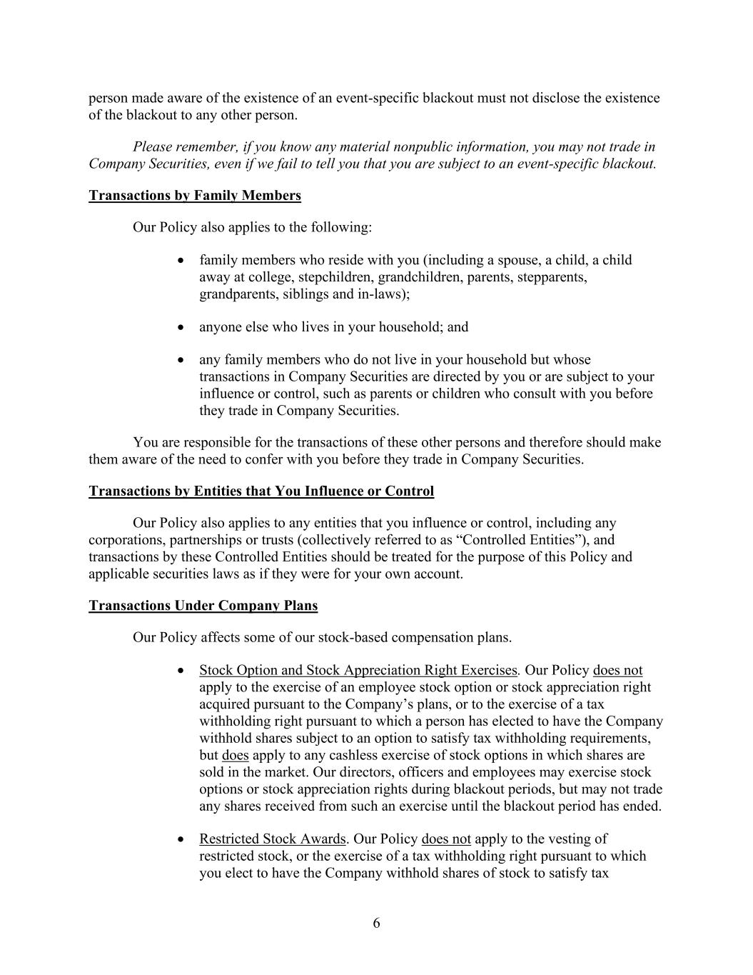 6 person made aware of the existence of an event-specific blackout must not disclose the existence of the blackout to any other person. Please remember, if you know any material nonpublic information, you may not trade in Company Securities, even if we fail to tell you that you are subject to an event-specific blackout. Transactions by Family Members Our Policy also applies to the following: • family members who reside with you (including a spouse, a child, a child away at college, stepchildren, grandchildren, parents, stepparents, grandparents, siblings and in-laws); • anyone else who lives in your household; and • any family members who do not live in your household but whose transactions in Company Securities are directed by you or are subject to your influence or control, such as parents or children who consult with you before they trade in Company Securities. You are responsible for the transactions of these other persons and therefore should make them aware of the need to confer with you before they trade in Company Securities. Transactions by Entities that You Influence or Control Our Policy also applies to any entities that you influence or control, including any corporations, partnerships or trusts (collectively referred to as “Controlled Entities”), and transactions by these Controlled Entities should be treated for the purpose of this Policy and applicable securities laws as if they were for your own account. Transactions Under Company Plans Our Policy affects some of our stock-based compensation plans. • Stock Option and Stock Appreciation Right Exercises. Our Policy does not apply to the exercise of an employee stock option or stock appreciation right acquired pursuant to the Company’s plans, or to the exercise of a tax withholding right pursuant to which a person has elected to have the Company withhold shares subject to an option to satisfy tax withholding requirements, but does apply to any cashless exercise of stock options in which shares are sold in the market. Our directors, officers and employees may exercise stock options or stock appreciation rights during blackout periods, but may not trade any shares received from such an exercise until the blackout period has ended. • Restricted Stock Awards. Our Policy does not apply to the vesting of restricted stock, or the exercise of a tax withholding right pursuant to which you elect to have the Company withhold shares of stock to satisfy tax