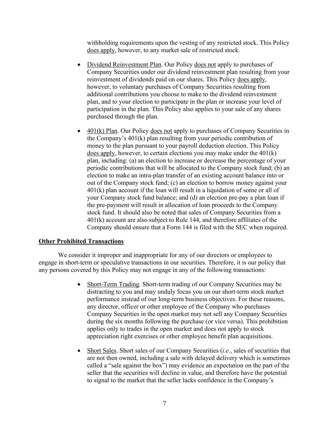7 withholding requirements upon the vesting of any restricted stock. This Policy does apply, however, to any market sale of restricted stock. • Dividend Reinvestment Plan. Our Policy does not apply to purchases of Company Securities under our dividend reinvestment plan resulting from your reinvestment of dividends paid on our shares. This Policy does apply, however, to voluntary purchases of Company Securities resulting from additional contributions you choose to make to the dividend reinvestment plan, and to your election to participate in the plan or increase your level of participation in the plan. This Policy also applies to your sale of any shares purchased through the plan. • 401(k) Plan. Our Policy does not apply to purchases of Company Securities in the Company’s 401(k) plan resulting from your periodic contribution of money to the plan pursuant to your payroll deduction election. This Policy does apply, however, to certain elections you may make under the 401(k) plan, including: (a) an election to increase or decrease the percentage of your periodic contributions that will be allocated to the Company stock fund; (b) an election to make an intra-plan transfer of an existing account balance into or out of the Company stock fund; (c) an election to borrow money against your 401(k) plan account if the loan will result in a liquidation of some or all of your Company stock fund balance; and (d) an election pre-pay a plan loan if the pre-payment will result in allocation of loan proceeds to the Company stock fund. It should also be noted that sales of Company Securities from a 401(k) account are also subject to Rule 144, and therefore affiliates of the Company should ensure that a Form 144 is filed with the SEC when required. Other Prohibited Transactions We consider it improper and inappropriate for any of our directors or employees to engage in short-term or speculative transactions in our securities. Therefore, it is our policy that any persons covered by this Policy may not engage in any of the following transactions: • Short-Term Trading. Short-term trading of our Company Securities may be distracting to you and may unduly focus you on our short-term stock market performance instead of our long-term business objectives. For these reasons, any director, officer or other employee of the Company who purchases Company Securities in the open market may not sell any Company Securities during the six months following the purchase (or vice versa). This prohibition applies only to trades in the open market and does not apply to stock appreciation right exercises or other employee benefit plan acquisitions. • Short Sales. Short sales of our Company Securities (i.e., sales of securities that are not then owned, including a sale with delayed delivery which is sometimes called a “sale against the box”) may evidence an expectation on the part of the seller that the securities will decline in value, and therefore have the potential to signal to the market that the seller lacks confidence in the Company’s
