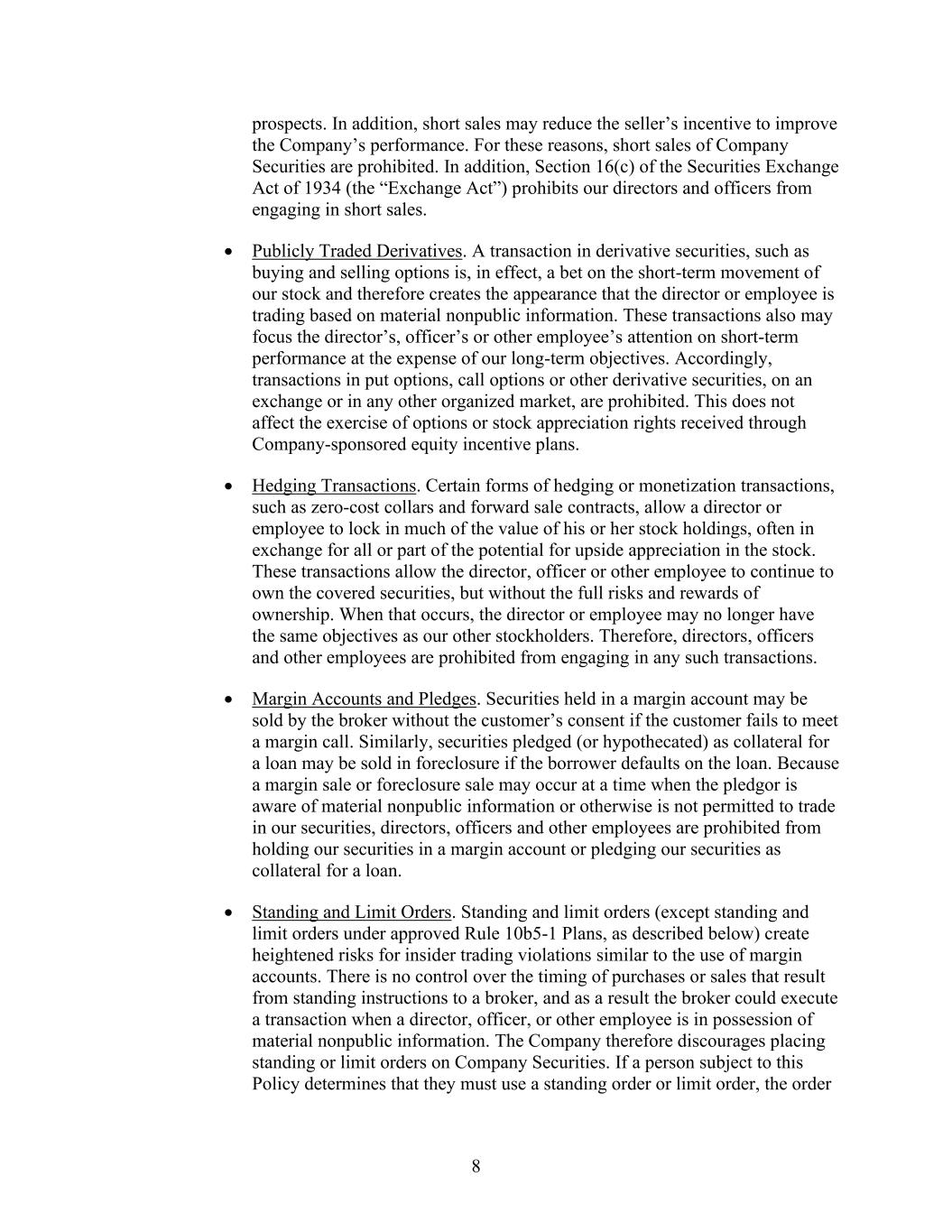 8 prospects. In addition, short sales may reduce the seller’s incentive to improve the Company’s performance. For these reasons, short sales of Company Securities are prohibited. In addition, Section 16(c) of the Securities Exchange Act of 1934 (the “Exchange Act”) prohibits our directors and officers from engaging in short sales. • Publicly Traded Derivatives. A transaction in derivative securities, such as buying and selling options is, in effect, a bet on the short-term movement of our stock and therefore creates the appearance that the director or employee is trading based on material nonpublic information. These transactions also may focus the director’s, officer’s or other employee’s attention on short-term performance at the expense of our long-term objectives. Accordingly, transactions in put options, call options or other derivative securities, on an exchange or in any other organized market, are prohibited. This does not affect the exercise of options or stock appreciation rights received through Company-sponsored equity incentive plans. • Hedging Transactions. Certain forms of hedging or monetization transactions, such as zero-cost collars and forward sale contracts, allow a director or employee to lock in much of the value of his or her stock holdings, often in exchange for all or part of the potential for upside appreciation in the stock. These transactions allow the director, officer or other employee to continue to own the covered securities, but without the full risks and rewards of ownership. When that occurs, the director or employee may no longer have the same objectives as our other stockholders. Therefore, directors, officers and other employees are prohibited from engaging in any such transactions. • Margin Accounts and Pledges. Securities held in a margin account may be sold by the broker without the customer’s consent if the customer fails to meet a margin call. Similarly, securities pledged (or hypothecated) as collateral for a loan may be sold in foreclosure if the borrower defaults on the loan. Because a margin sale or foreclosure sale may occur at a time when the pledgor is aware of material nonpublic information or otherwise is not permitted to trade in our securities, directors, officers and other employees are prohibited from holding our securities in a margin account or pledging our securities as collateral for a loan. • Standing and Limit Orders. Standing and limit orders (except standing and limit orders under approved Rule 10b5-1 Plans, as described below) create heightened risks for insider trading violations similar to the use of margin accounts. There is no control over the timing of purchases or sales that result from standing instructions to a broker, and as a result the broker could execute a transaction when a director, officer, or other employee is in possession of material nonpublic information. The Company therefore discourages placing standing or limit orders on Company Securities. If a person subject to this Policy determines that they must use a standing order or limit order, the order