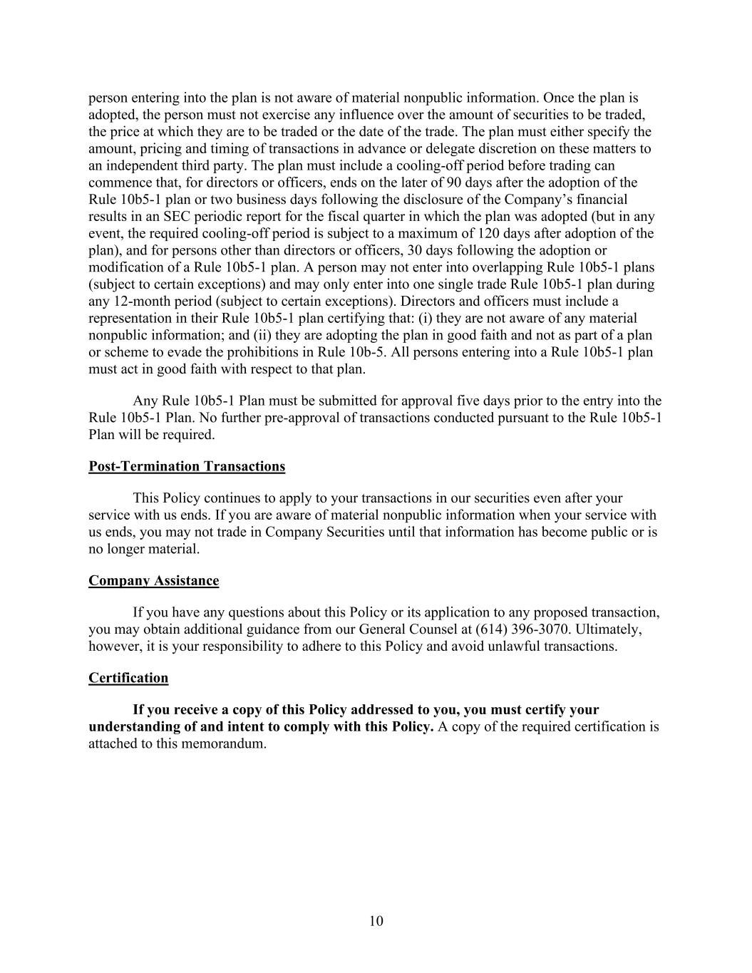 10 person entering into the plan is not aware of material nonpublic information. Once the plan is adopted, the person must not exercise any influence over the amount of securities to be traded, the price at which they are to be traded or the date of the trade. The plan must either specify the amount, pricing and timing of transactions in advance or delegate discretion on these matters to an independent third party. The plan must include a cooling-off period before trading can commence that, for directors or officers, ends on the later of 90 days after the adoption of the Rule 10b5-1 plan or two business days following the disclosure of the Company’s financial results in an SEC periodic report for the fiscal quarter in which the plan was adopted (but in any event, the required cooling-off period is subject to a maximum of 120 days after adoption of the plan), and for persons other than directors or officers, 30 days following the adoption or modification of a Rule 10b5-1 plan. A person may not enter into overlapping Rule 10b5-1 plans (subject to certain exceptions) and may only enter into one single trade Rule 10b5-1 plan during any 12-month period (subject to certain exceptions). Directors and officers must include a representation in their Rule 10b5-1 plan certifying that: (i) they are not aware of any material nonpublic information; and (ii) they are adopting the plan in good faith and not as part of a plan or scheme to evade the prohibitions in Rule 10b-5. All persons entering into a Rule 10b5-1 plan must act in good faith with respect to that plan. Any Rule 10b5-1 Plan must be submitted for approval five days prior to the entry into the Rule 10b5-1 Plan. No further pre-approval of transactions conducted pursuant to the Rule 10b5-1 Plan will be required. Post-Termination Transactions This Policy continues to apply to your transactions in our securities even after your service with us ends. If you are aware of material nonpublic information when your service with us ends, you may not trade in Company Securities until that information has become public or is no longer material. Company Assistance If you have any questions about this Policy or its application to any proposed transaction, you may obtain additional guidance from our General Counsel at (614) 396-3070. Ultimately, however, it is your responsibility to adhere to this Policy and avoid unlawful transactions. Certification If you receive a copy of this Policy addressed to you, you must certify your understanding of and intent to comply with this Policy. A copy of the required certification is attached to this memorandum.