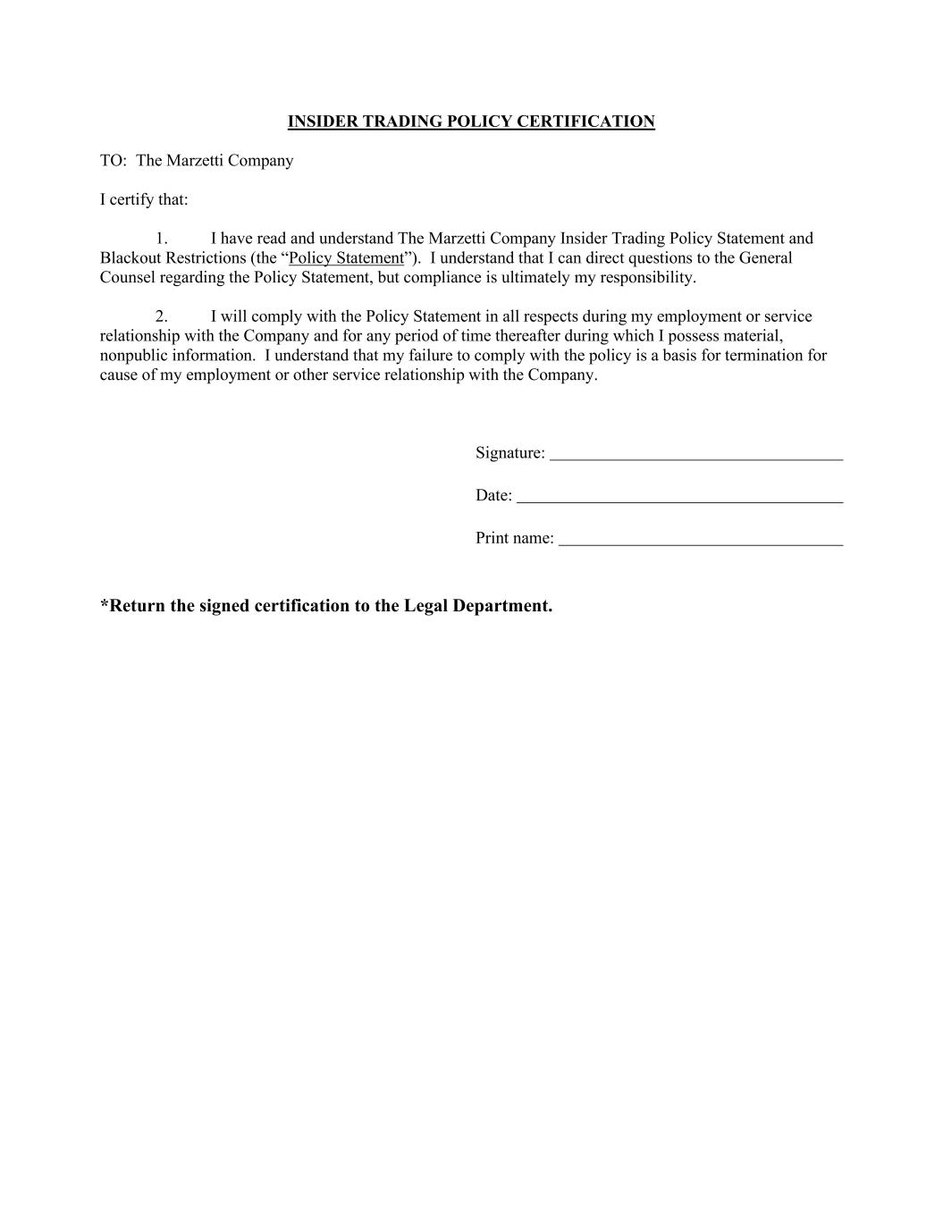 INSIDER TRADING POLICY CERTIFICATION TO: The Marzetti Company I certify that: 1. I have read and understand The Marzetti Company Insider Trading Policy Statement and Blackout Restrictions (the “Policy Statement”). I understand that I can direct questions to the General Counsel regarding the Policy Statement, but compliance is ultimately my responsibility. 2. I will comply with the Policy Statement in all respects during my employment or service relationship with the Company and for any period of time thereafter during which I possess material, nonpublic information. I understand that my failure to comply with the policy is a basis for termination for cause of my employment or other service relationship with the Company. Signature: Date: Print name: *Return the signed certification to the Legal Department.