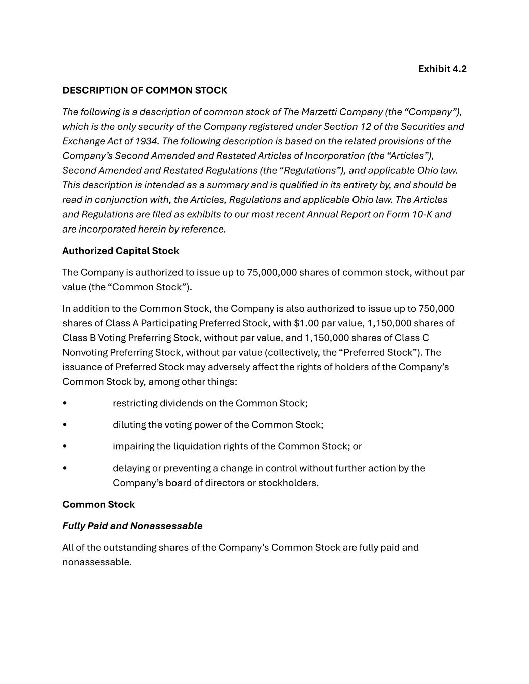 Exhibit 4.2 DESCRIPTION OF COMMON STOCK The following is a description of common stock of The Marzetti Company (the “Company”), which is the only security of the Company registered under Section 12 of the Securities and Exchange Act of 1934. The following description is based on the related provisions of the Company’s Second Amended and Restated Articles of Incorporation (the “Articles”), Second Amended and Restated Regulations (the “Regulations”), and applicable Ohio law. This description is intended as a summary and is qualified in its entirety by, and should be read in conjunction with, the Articles, Regulations and applicable Ohio law. The Articles and Regulations are filed as exhibits to our most recent Annual Report on Form 10-K and are incorporated herein by reference. Authorized Capital Stock The Company is authorized to issue up to 75,000,000 shares of common stock, without par value (the “Common Stock”). In addition to the Common Stock, the Company is also authorized to issue up to 750,000 shares of Class A Participating Preferred Stock, with $1.00 par value, 1,150,000 shares of Class B Voting Preferring Stock, without par value, and 1,150,000 shares of Class C Nonvoting Preferring Stock, without par value (collectively, the “Preferred Stock”). The issuance of Preferred Stock may adversely affect the rights of holders of the Company’s Common Stock by, among other things: • restricting dividends on the Common Stock; • diluting the voting power of the Common Stock; • impairing the liquidation rights of the Common Stock; or • delaying or preventing a change in control without further action by the Company’s board of directors or stockholders. Common Stock Fully Paid and Nonassessable All of the outstanding shares of the Company’s Common Stock are fully paid and nonassessable.