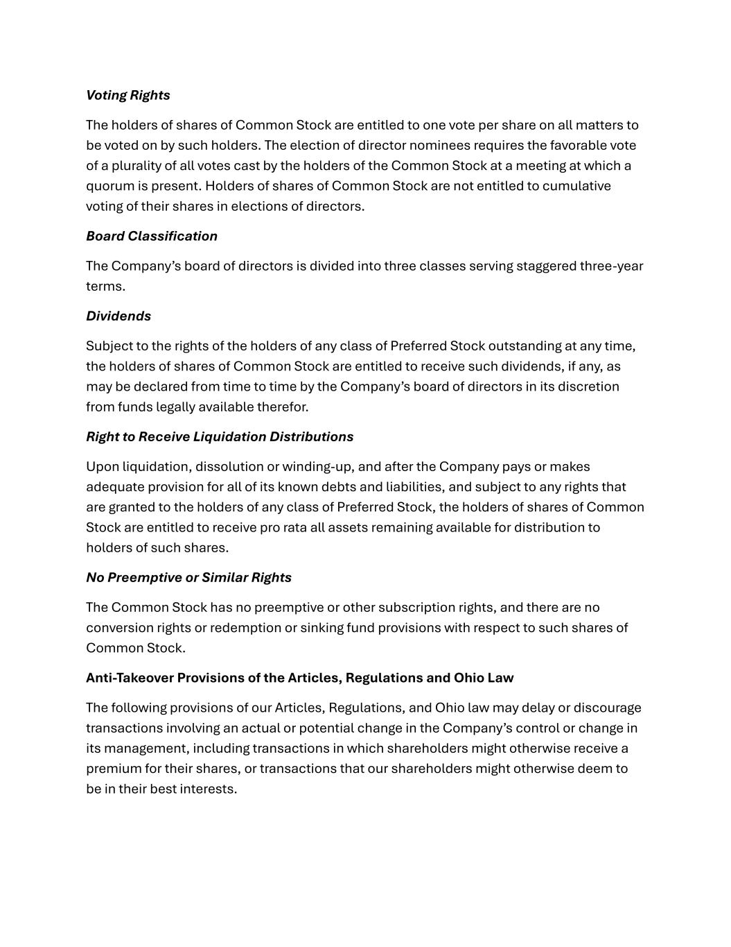 Voting Rights The holders of shares of Common Stock are entitled to one vote per share on all matters to be voted on by such holders. The election of director nominees requires the favorable vote of a plurality of all votes cast by the holders of the Common Stock at a meeting at which a quorum is present. Holders of shares of Common Stock are not entitled to cumulative voting of their shares in elections of directors. Board Classification The Company’s board of directors is divided into three classes serving staggered three-year terms. Dividends Subject to the rights of the holders of any class of Preferred Stock outstanding at any time, the holders of shares of Common Stock are entitled to receive such dividends, if any, as may be declared from time to time by the Company’s board of directors in its discretion from funds legally available therefor. Right to Receive Liquidation Distributions Upon liquidation, dissolution or winding-up, and after the Company pays or makes adequate provision for all of its known debts and liabilities, and subject to any rights that are granted to the holders of any class of Preferred Stock, the holders of shares of Common Stock are entitled to receive pro rata all assets remaining available for distribution to holders of such shares. No Preemptive or Similar Rights The Common Stock has no preemptive or other subscription rights, and there are no conversion rights or redemption or sinking fund provisions with respect to such shares of Common Stock. Anti-Takeover Provisions of the Articles, Regulations and Ohio Law The following provisions of our Articles, Regulations, and Ohio law may delay or discourage transactions involving an actual or potential change in the Company’s control or change in its management, including transactions in which shareholders might otherwise receive a premium for their shares, or transactions that our shareholders might otherwise deem to be in their best interests.