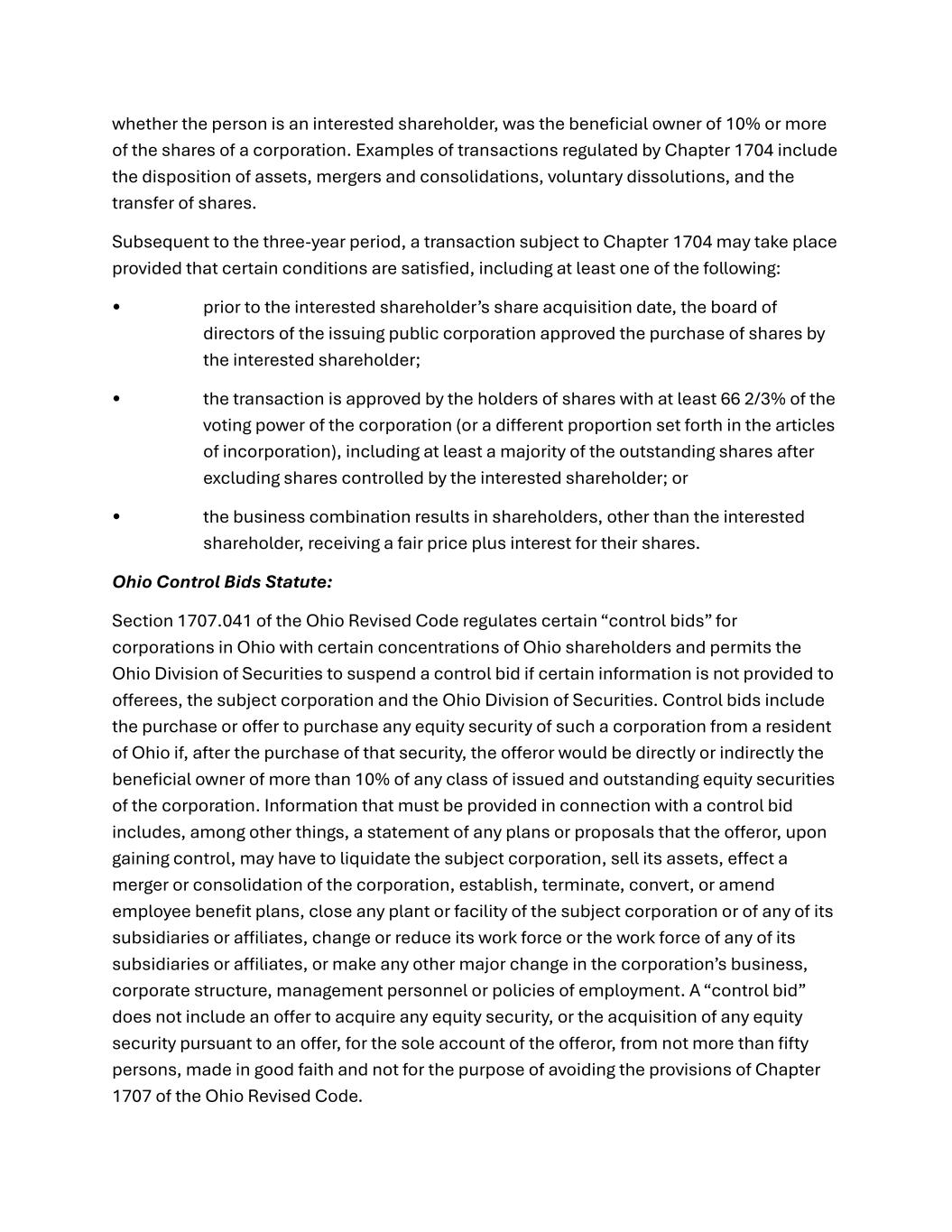 whether the person is an interested shareholder, was the beneficial owner of 10% or more of the shares of a corporation. Examples of transactions regulated by Chapter 1704 include the disposition of assets, mergers and consolidations, voluntary dissolutions, and the transfer of shares. Subsequent to the three-year period, a transaction subject to Chapter 1704 may take place provided that certain conditions are satisfied, including at least one of the following: • prior to the interested shareholder’s share acquisition date, the board of directors of the issuing public corporation approved the purchase of shares by the interested shareholder; • the transaction is approved by the holders of shares with at least 66 2/3% of the voting power of the corporation (or a different proportion set forth in the articles of incorporation), including at least a majority of the outstanding shares after excluding shares controlled by the interested shareholder; or • the business combination results in shareholders, other than the interested shareholder, receiving a fair price plus interest for their shares. Ohio Control Bids Statute: Section 1707.041 of the Ohio Revised Code regulates certain “control bids” for corporations in Ohio with certain concentrations of Ohio shareholders and permits the Ohio Division of Securities to suspend a control bid if certain information is not provided to offerees, the subject corporation and the Ohio Division of Securities. Control bids include the purchase or offer to purchase any equity security of such a corporation from a resident of Ohio if, after the purchase of that security, the offeror would be directly or indirectly the beneficial owner of more than 10% of any class of issued and outstanding equity securities of the corporation. Information that must be provided in connection with a control bid includes, among other things, a statement of any plans or proposals that the offeror, upon gaining control, may have to liquidate the subject corporation, sell its assets, effect a merger or consolidation of the corporation, establish, terminate, convert, or amend employee benefit plans, close any plant or facility of the subject corporation or of any of its subsidiaries or affiliates, change or reduce its work force or the work force of any of its subsidiaries or affiliates, or make any other major change in the corporation’s business, corporate structure, management personnel or policies of employment. A “control bid” does not include an offer to acquire any equity security, or the acquisition of any equity security pursuant to an offer, for the sole account of the offeror, from not more than fifty persons, made in good faith and not for the purpose of avoiding the provisions of Chapter 1707 of the Ohio Revised Code.