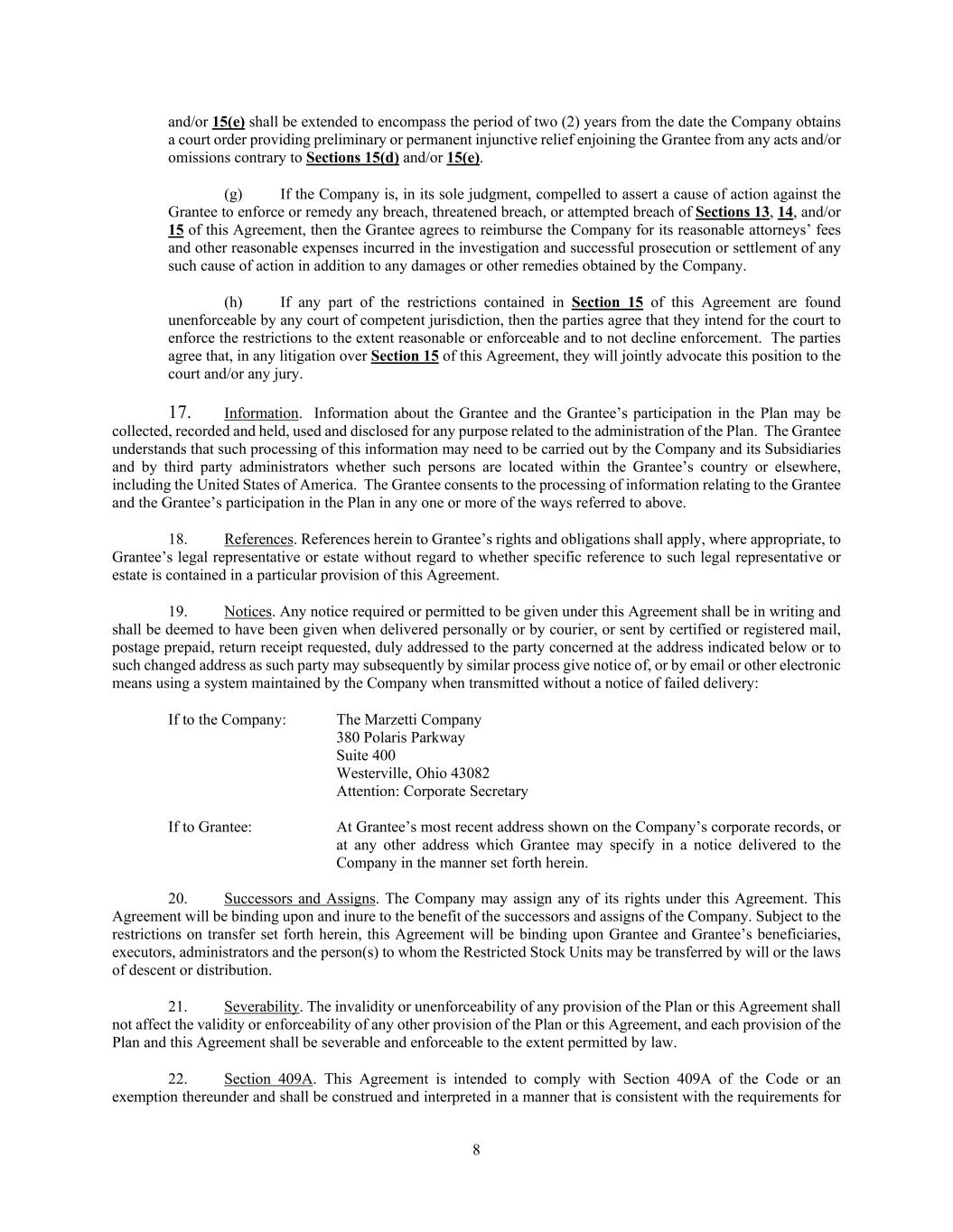8 and/or 15(e) shall be extended to encompass the period of two (2) years from the date the Company obtains a court order providing preliminary or permanent injunctive relief enjoining the Grantee from any acts and/or omissions contrary to Sections 15(d) and/or 15(e). (g) If the Company is, in its sole judgment, compelled to assert a cause of action against the Grantee to enforce or remedy any breach, threatened breach, or attempted breach of Sections 13, 14, and/or 15 of this Agreement, then the Grantee agrees to reimburse the Company for its reasonable attorneys’ fees and other reasonable expenses incurred in the investigation and successful prosecution or settlement of any such cause of action in addition to any damages or other remedies obtained by the Company. (h) If any part of the restrictions contained in Section 15 of this Agreement are found unenforceable by any court of competent jurisdiction, then the parties agree that they intend for the court to enforce the restrictions to the extent reasonable or enforceable and to not decline enforcement. The parties agree that, in any litigation over Section 15 of this Agreement, they will jointly advocate this position to the court and/or any jury. 17. Information. Information about the Grantee and the Grantee’s participation in the Plan may be collected, recorded and held, used and disclosed for any purpose related to the administration of the Plan. The Grantee understands that such processing of this information may need to be carried out by the Company and its Subsidiaries and by third party administrators whether such persons are located within the Grantee’s country or elsewhere, including the United States of America. The Grantee consents to the processing of information relating to the Grantee and the Grantee’s participation in the Plan in any one or more of the ways referred to above. 18. References. References herein to Grantee’s rights and obligations shall apply, where appropriate, to Grantee’s legal representative or estate without regard to whether specific reference to such legal representative or estate is contained in a particular provision of this Agreement. 19. Notices. Any notice required or permitted to be given under this Agreement shall be in writing and shall be deemed to have been given when delivered personally or by courier, or sent by certified or registered mail, postage prepaid, return receipt requested, duly addressed to the party concerned at the address indicated below or to such changed address as such party may subsequently by similar process give notice of, or by email or other electronic means using a system maintained by the Company when transmitted without a notice of failed delivery: If to the Company: The Marzetti Company 380 Polaris Parkway Suite 400 Westerville, Ohio 43082 Attention: Corporate Secretary If to Grantee: At Grantee’s most recent address shown on the Company’s corporate records, or at any other address which Grantee may specify in a notice delivered to the Company in the manner set forth herein. 20. Successors and Assigns. The Company may assign any of its rights under this Agreement. This Agreement will be binding upon and inure to the benefit of the successors and assigns of the Company. Subject to the restrictions on transfer set forth herein, this Agreement will be binding upon Grantee and Grantee’s beneficiaries, executors, administrators and the person(s) to whom the Restricted Stock Units may be transferred by will or the laws of descent or distribution. 21. Severability. The invalidity or unenforceability of any provision of the Plan or this Agreement shall not affect the validity or enforceability of any other provision of the Plan or this Agreement, and each provision of the Plan and this Agreement shall be severable and enforceable to the extent permitted by law. 22. Section 409A. This Agreement is intended to comply with Section 409A of the Code or an exemption thereunder and shall be construed and interpreted in a manner that is consistent with the requirements for