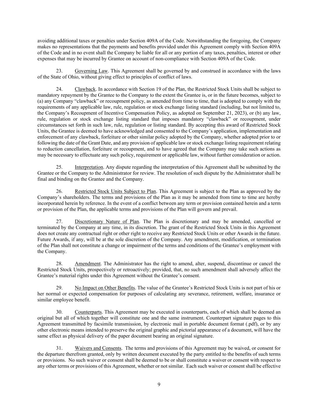 9 avoiding additional taxes or penalties under Section 409A of the Code. Notwithstanding the foregoing, the Company makes no representations that the payments and benefits provided under this Agreement comply with Section 409A of the Code and in no event shall the Company be liable for all or any portion of any taxes, penalties, interest or other expenses that may be incurred by Grantee on account of non-compliance with Section 409A of the Code. 23. Governing Law. This Agreement shall be governed by and construed in accordance with the laws of the State of Ohio, without giving effect to principles of conflict of laws. 24. Clawback. In accordance with Section 19 of the Plan, the Restricted Stock Units shall be subject to mandatory repayment by the Grantee to the Company to the extent the Grantee is, or in the future becomes, subject to (a) any Company “clawback” or recoupment policy, as amended from time to time, that is adopted to comply with the requirements of any applicable law, rule, regulation or stock exchange listing standard (including, but not limited to, the Company’s Recoupment of Incentive Compensation Policy, as adopted on September 21, 2023), or (b) any law, rule, regulation or stock exchange listing standard that imposes mandatory “clawback” or recoupment, under circumstances set forth in such law, rule, regulation or listing standard. By accepting this award of Restricted Stock Units, the Grantee is deemed to have acknowledged and consented to the Company’s application, implementation and enforcement of any clawback, forfeiture or other similar policy adopted by the Company, whether adopted prior to or following the date of the Grant Date, and any provision of applicable law or stock exchange listing requirement relating to reduction cancellation, forfeiture or recoupment, and to have agreed that the Company may take such actions as may be necessary to effectuate any such policy, requirement or applicable law, without further consideration or action. 25. Interpretation. Any dispute regarding the interpretation of this Agreement shall be submitted by the Grantee or the Company to the Administrator for review. The resolution of such dispute by the Administrator shall be final and binding on the Grantee and the Company. 26. Restricted Stock Units Subject to Plan. This Agreement is subject to the Plan as approved by the Company’s shareholders. The terms and provisions of the Plan as it may be amended from time to time are hereby incorporated herein by reference. In the event of a conflict between any term or provision contained herein and a term or provision of the Plan, the applicable terms and provisions of the Plan will govern and prevail. 27. Discretionary Nature of Plan. The Plan is discretionary and may be amended, cancelled or terminated by the Company at any time, in its discretion. The grant of the Restricted Stock Units in this Agreement does not create any contractual right or other right to receive any Restricted Stock Units or other Awards in the future. Future Awards, if any, will be at the sole discretion of the Company. Any amendment, modification, or termination of the Plan shall not constitute a change or impairment of the terms and conditions of the Grantee’s employment with the Company. 28. Amendment. The Administrator has the right to amend, alter, suspend, discontinue or cancel the Restricted Stock Units, prospectively or retroactively; provided, that, no such amendment shall adversely affect the Grantee’s material rights under this Agreement without the Grantee’s consent. 29. No Impact on Other Benefits. The value of the Grantee’s Restricted Stock Units is not part of his or her normal or expected compensation for purposes of calculating any severance, retirement, welfare, insurance or similar employee benefit. 30. Counterparts. This Agreement may be executed in counterparts, each of which shall be deemed an original but all of which together will constitute one and the same instrument. Counterpart signature pages to this Agreement transmitted by facsimile transmission, by electronic mail in portable document format (.pdf), or by any other electronic means intended to preserve the original graphic and pictorial appearance of a document, will have the same effect as physical delivery of the paper document bearing an original signature. 31. Waivers and Consents. The terms and provisions of this Agreement may be waived, or consent for the departure therefrom granted, only by written document executed by the party entitled to the benefits of such terms or provisions. No such waiver or consent shall be deemed to be or shall constitute a waiver or consent with respect to any other terms or provisions of this Agreement, whether or not similar. Each such waiver or consent shall be effective