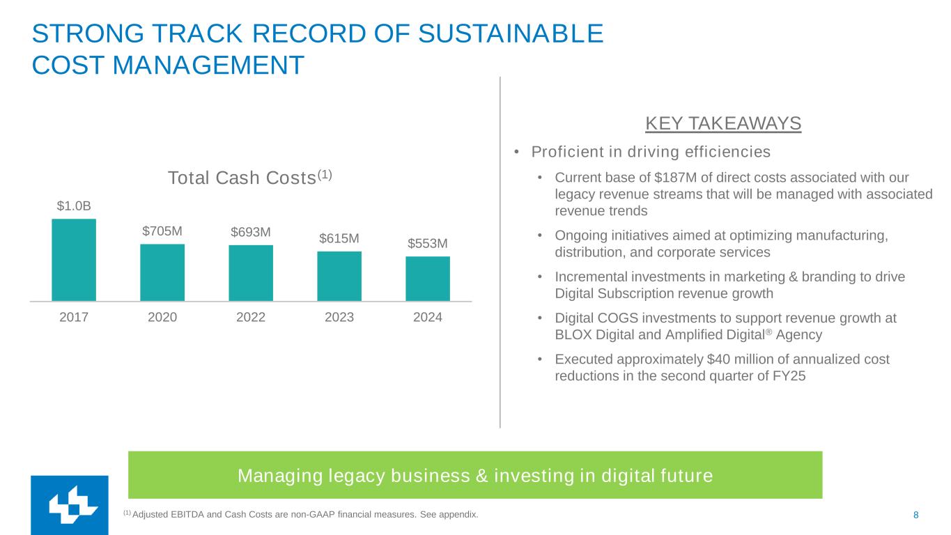 7 SECOND QUARTER 2025 RESULTS (1) Same-store revenues is a non-GAAP performance measure based on U.S. GAAP revenues for Lee for the current period, excluding exited operations. Exited operations include (1) business divestitures and (2) the elimination of stand-alone print products discontinued within our markets. (2) Adjusted EBITDA and Cash Costs are non-GAAP financial measures. See appendix. Q2 Revenue Total Operating Revenue $137M, -6% YOY, or -5% on a same-store basis(1) Total Digital Revenue $73M, +4% YOY(1) • Digital subscription $24M, +20%(1) • Digital advertising $44M, -2%(1) • Amplified Digital® agency $25M, +9%(1) Total Print Revenue $65M, -14%(1) Q2 Cash Costs(2) • Total Cash Costs $131M, -2% YOY Q2 Adjusted EBITDA(2) • Adjusted EBITDA $8M Continued digital revenue growth Strong cost control of legacy business Investments to drive digital transformation