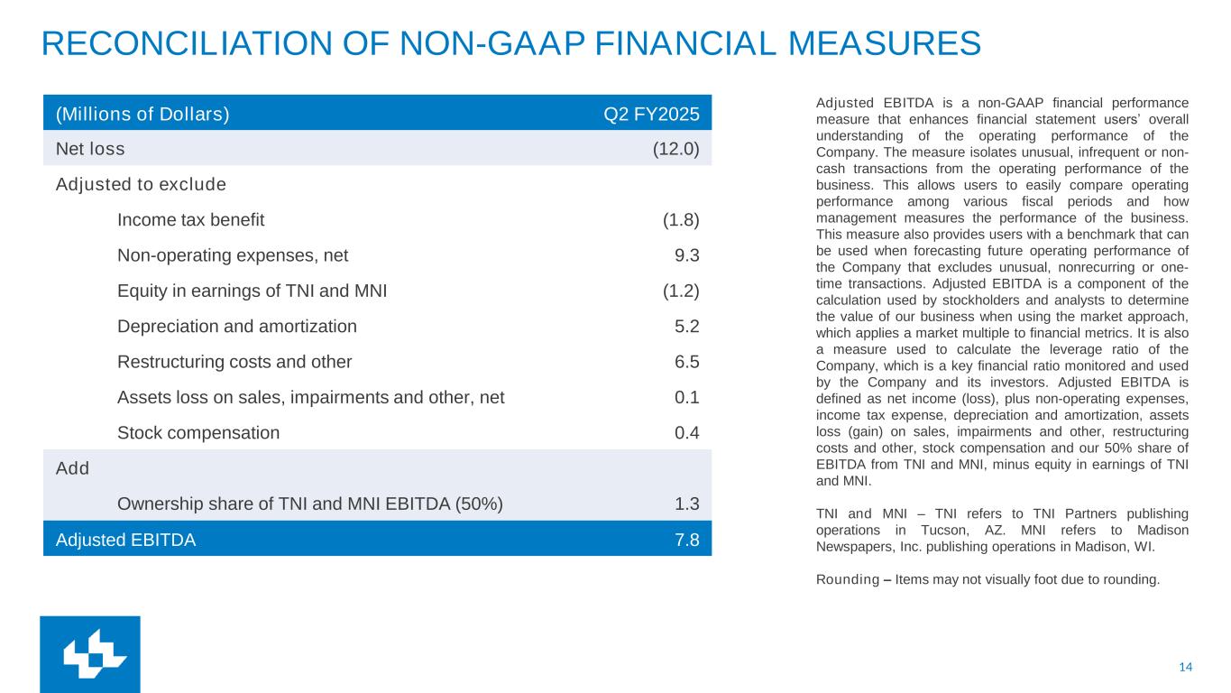 14 RECONCILIATION OF NON-GAAP FINANCIAL MEASURES Adjusted EBITDA is a non-GAAP financial performance measure that enhances financial statement users’ overall understanding of the operating performance of the Company. The measure isolates unusual, infrequent or non- cash transactions from the operating performance of the business. This allows users to easily compare operating performance among various fiscal periods and how management measures the performance of the business. This measure also provides users with a benchmark that can be used when forecasting future operating performance of the Company that excludes unusual, nonrecurring or one- time transactions. Adjusted EBITDA is a component of the calculation used by stockholders and analysts to determine the value of our business when using the market approach, which applies a market multiple to financial metrics. It is also a measure used to calculate the leverage ratio of the Company, which is a key financial ratio monitored and used by the Company and its investors. Adjusted EBITDA is defined as net income (loss), plus non-operating expenses, income tax expense, depreciation and amortization, assets loss (gain) on sales, impairments and other, restructuring costs and other, stock compensation and our 50% share of EBITDA from TNI and MNI, minus equity in earnings of TNI and MNI. TNI and MNI – TNI refers to TNI Partners publishing operations in Tucson, AZ. MNI refers to Madison Newspapers, Inc. publishing operations in Madison, WI. Rounding – Items may not visually foot due to rounding. (Millions of Dollars) Q2 FY2025 Net loss (12.0) Adjusted to exclude Income tax benefit (1.8) Non-operating expenses, net 9.3 Equity in earnings of TNI and MNI (1.2) Depreciation and amortization 5.2 Restructuring costs and other 6.5 Assets loss on sales, impairments and other, net 0.1 Stock compensation 0.4 Add Ownership share of TNI and MNI EBITDA (50%) 1.3 Adjusted EBITDA 7.8