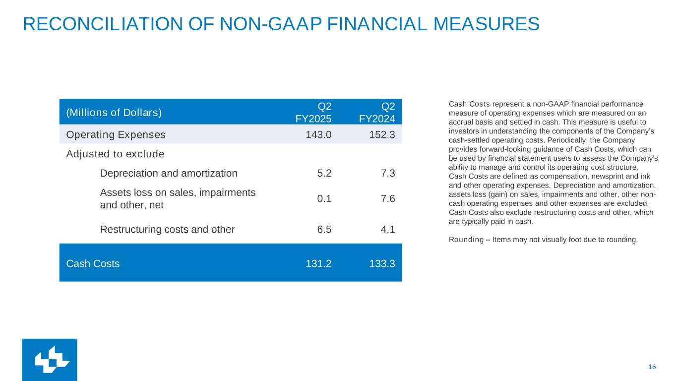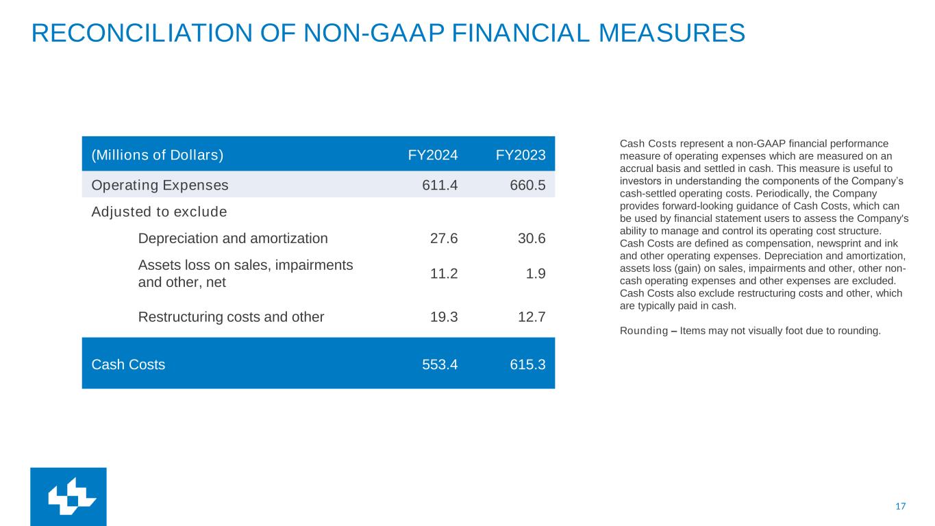 16 RECONCILIATION OF NON-GAAP FINANCIAL MEASURES Cash Costs represent a non-GAAP financial performance measure of operating expenses which are measured on an accrual basis and settled in cash. This measure is useful to investors in understanding the components of the Company’s cash-settled operating costs. Periodically, the Company provides forward-looking guidance of Cash Costs, which can be used by financial statement users to assess the Company's ability to manage and control its operating cost structure. Cash Costs are defined as compensation, newsprint and ink and other operating expenses. Depreciation and amortization, assets loss (gain) on sales, impairments and other, other non- cash operating expenses and other expenses are excluded. Cash Costs also exclude restructuring costs and other, which are typically paid in cash. Rounding – Items may not visually foot due to rounding. (Millions of Dollars) Q2 FY2025 Q2 FY2024 Operating Expenses 143.0 152.3 Adjusted to exclude Depreciation and amortization 5.2 7.3 Assets loss on sales, impairments and other, net 0.1 7.6 Restructuring costs and other 6.5 4.1 Cash Costs 131.2 133.3