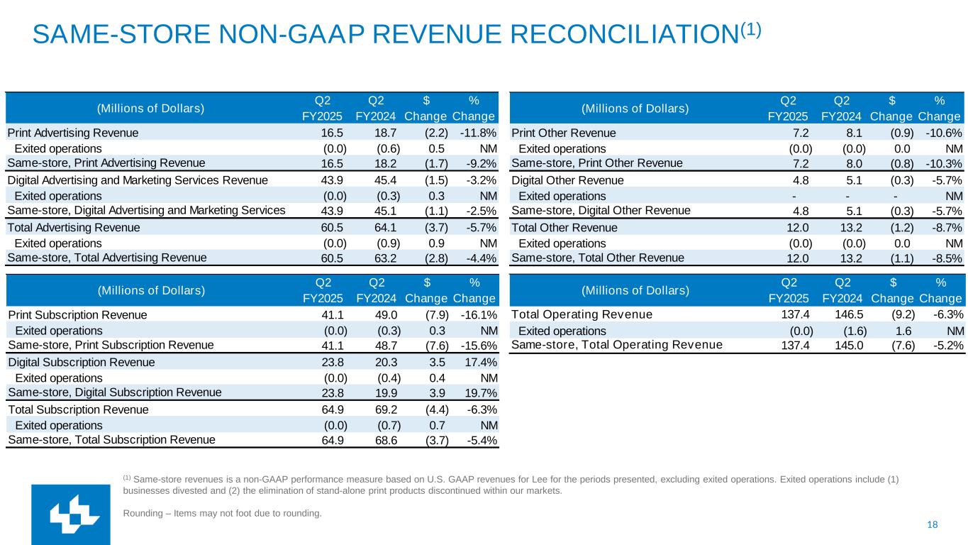 19 SAME-STORE NON-GAAP REVENUE RECONCILIATION(1) (1) Same-store revenues is a non-GAAP performance measure based on U.S. GAAP revenues for Lee for the periods presented, excluding exited operations. Exited operations include (1) businesses divested and (2) the elimination of stand-alone print products discontinued within our markets. Rounding – Items may not foot due to rounding. (Millions of Dollars) 1H FY2025 1H FY2024 $ Change % Change Print Advertising Revenue 36.4 43.2 (6.8) -15.7% Exited operations (0.1) (1.5) 1.4 NM Same-store, Print Advertising Revenue 36.3 41.6 (5.3) -12.8% Digital Advertising and Marketing Services Revenue 90.7 91.8 (1.2) -1.3% Exited operations (0.0) (0.8) 0.8 NM Same-store, Digital Advertising and Marketing Services 90.7 91.0 (0.4) -0.4% Total Advertising Revenue 127.1 135.0 (8.0) -5.9% Exited operations (0.1) (2.4) 2.3 NM Same-store, Total Advertising Revenue 127.0 132.7 (5.7) -4.3% (Millions of Dollars) 1H FY2025 1H FY2024 $ Change % Change Print Subscription Revenue 84.5 100.8 (16.3) -16.2% Exited operations (0.0) (0.8) 0.7 NM Same-store, Print Subscription Revenue 84.5 100.1 (15.6) -15.6% Digital Subscription Revenue 45.4 39.7 5.6 14.2% Exited operations (0.0) (0.9) 0.9 NM Same-store, Digital Subscription Revenue 45.4 38.9 6.5 16.7% Total Subscription Revenue 129.9 140.6 (10.7) -7.6% Exited operations (0.0) (1.6) 1.6 NM Same-store, Total Subscription Revenue 129.8 139.0 (9.1) -6.6% (Millions of Dollars) 1H FY2025 1H FY2024 $ Change % Change Print Other Revenue 15.1 16.6 (1.5) -8.8% Exited operations (0.0) (0.0) 0.0 NM Same-store, Print Other Revenue 15.1 16.5 (1.4) -8.6% Digital Other Revenue 9.9 10.1 (0.2) -1.7% Exited operations - - - NM Same-store, Digital Other Revenue 9.9 10.1 (0.2) -1.7% Total Other Revenue 25.0 26.6 (1.6) -6.1% Exited operations (0.0) (0.0) 0.0 NM Same-store, Total Other Revenue 25.0 26.6 (1.6) -6.0% (Millions of Dollars) 1H FY2025 1H FY2024 $ Change % Change Total Operating Revenue 281.9 302.2 (20.3) -6.7% Exited operations (0.1) (4.0) 3.9 NM Same-store, Total Operating Revenue 281.8 298.2 (16.4) -5.5%