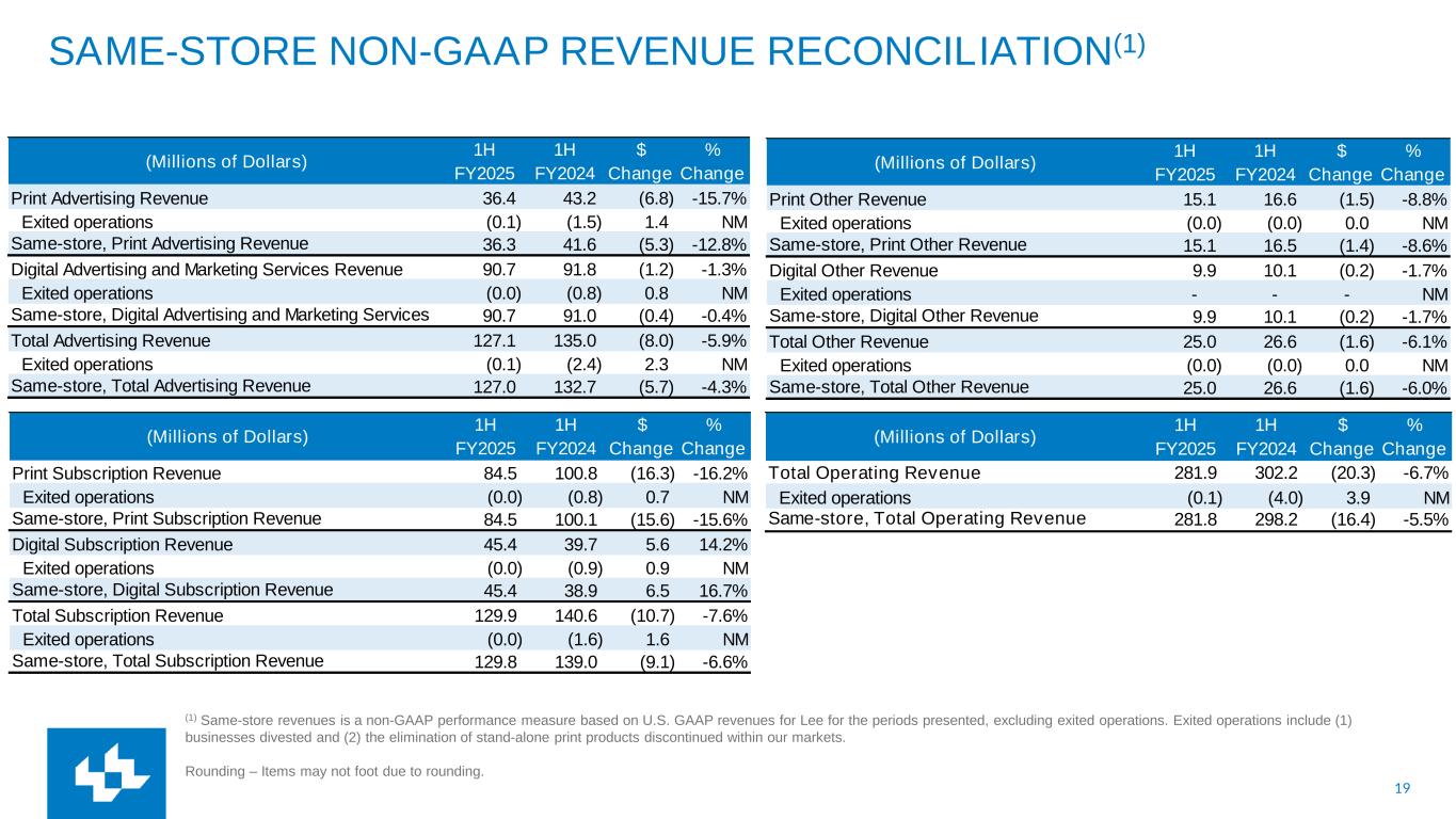 18 SAME-STORE NON-GAAP REVENUE RECONCILIATION(1) (1) Same-store revenues is a non-GAAP performance measure based on U.S. GAAP revenues for Lee for the periods presented, excluding exited operations. Exited operations include (1) businesses divested and (2) the elimination of stand-alone print products discontinued within our markets. Rounding – Items may not foot due to rounding. (Millions of Dollars) Q2 FY2025 Q2 FY2024 $ Change % Change Print Other Revenue 7.2 8.1 (0.9) -10.6% Exited operations (0.0) (0.0) 0.0 NM Same-store, Print Other Revenue 7.2 8.0 (0.8) -10.3% Digital Other Revenue 4.8 5.1 (0.3) -5.7% Exited operations - - - NM Same-store, Digital Other Revenue 4.8 5.1 (0.3) -5.7% Total Other Revenue 12.0 13.2 (1.2) -8.7% Exited operations (0.0) (0.0) 0.0 NM Same-store, Total Other Revenue 12.0 13.2 (1.1) -8.5% (Millions of Dollars) Q2 FY2025 Q2 FY2024 $ Change % Change Total Operating Revenue 137.4 146.5 (9.2) -6.3% Exited operations (0.0) (1.6) 1.6 NM Same-store, Total Operating Revenue 137.4 145.0 (7.6) -5.2% (Millions of Dollars) Q2 FY2025 Q2 FY2024 $ Change % Change Print Advertising Revenue 16.5 18.7 (2.2) -11.8% Exited operations (0.0) (0.6) 0.5 NM Same-store, Print Advertising Revenue 16.5 18.2 (1.7) -9.2% Digital Advertising and Marketing Services Revenue 43.9 45.4 (1.5) -3.2% Exited operations (0.0) (0.3) 0.3 NM Same-store, Digital Advertising and Marketing Services 43.9 45.1 (1.1) -2.5% Total Advertising Revenue 60.5 64.1 (3.7) -5.7% Exited operations (0.0) (0.9) 0.9 NM Same-store, Total Advertising Revenue 60.5 63.2 (2.8) -4.4% (Millions of Dollars) Q2 FY2025 Q2 FY2024 $ Change % Change Print Subscription Revenue 41.1 49.0 (7.9) -16.1% Exited operations (0.0) (0.3) 0.3 NM Same-store, Print Subscription Revenue 41.1 48.7 (7.6) -15.6% Digital Subscription Revenue 23.8 20.3 3.5 17.4% Exited operations (0.0) (0.4) 0.4 NM Same-store, Digital Subscription Revenue 23.8 19.9 3.9 19.7% Total Subscription Revenue 64.9 69.2 (4.4) -6.3% Exited operations (0.0) (0.7) 0.7 NM Same-store, Total Subscription Revenue 64.9 68.6 (3.7) -5.4%