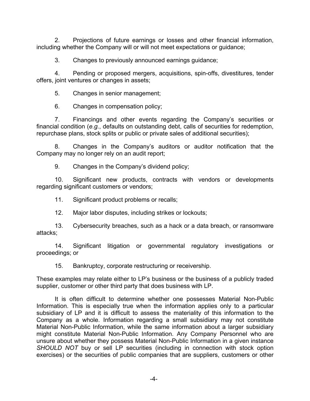 -4- 2. Projections of future earnings or losses and other financial information, including whether the Company will or will not meet expectations or guidance; 3. Changes to previously announced earnings guidance; 4. Pending or proposed mergers, acquisitions, spin-offs, divestitures, tender offers, joint ventures or changes in assets; 5. Changes in senior management; 6. Changes in compensation policy; 7. Financings and other events regarding the Company’s securities or financial condition (e.g., defaults on outstanding debt, calls of securities for redemption, repurchase plans, stock splits or public or private sales of additional securities); 8. Changes in the Company’s auditors or auditor notification that the Company may no longer rely on an audit report; 9. Changes in the Company’s dividend policy; 10. Significant new products, contracts with vendors or developments regarding significant customers or vendors; 11. Significant product problems or recalls; 12. Major labor disputes, including strikes or lockouts; 13. Cybersecurity breaches, such as a hack or a data breach, or ransomware attacks; 14. Significant litigation or governmental regulatory investigations or proceedings; or 15. Bankruptcy, corporate restructuring or receivership. These examples may relate either to LP’s business or the business of a publicly traded supplier, customer or other third party that does business with LP. It is often difficult to determine whether one possesses Material Non-Public Information. This is especially true when the information applies only to a particular subsidiary of LP and it is difficult to assess the materiality of this information to the Company as a whole. Information regarding a small subsidiary may not constitute Material Non-Public Information, while the same information about a larger subsidiary might constitute Material Non-Public Information. Any Company Personnel who are unsure about whether they possess Material Non-Public Information in a given instance SHOULD NOT buy or sell LP securities (including in connection with stock option exercises) or the securities of public companies that are suppliers, customers or other