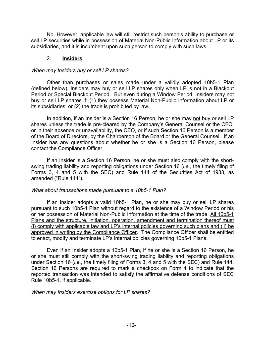 -9- 8. Maintaining and updating the Insider Identification List and a list of Section 16 Persons, as necessary; and 9. Reviewing and approving 10b5-1 Plans and any amendments thereto. The Compliance Officer may designate one or more individuals, which may include outside counsel, to assist in performance of the foregoing. FREQUENTLY ASKED QUESTIONS This remainder of this Policy is presented in question and answer format, and is divided between those other than Insiders (“Non-Insiders”) and Insiders. All questions and concerns about this Policy should be directed to the Compliance Officer. 1. Non-Insiders. When may Non-Insiders buy or sell LP shares? Non-Insiders may buy or sell LP shares at any time (irrespective of any Blackout Period), unless: (1) the person possesses Material Non-Public Information about LP or its subsidiaries; or (2) the trade is prohibited by law. When may Non-Insiders exercise options for LP shares? Non-Insiders may exercise their options at any time, and all exercises are subject to the terms of applicable equity incentive plans of LP and the terms of the applicable option grant agreements. How does the possession of Material Non-Public Information affect Non-Insiders regarding option exercises? Non-Insiders may exercise options even if they possess Material Non-Public Information about LP or its subsidiaries; however, they may not sell any of the shares that they acquire if and while they possess Material Non-Public Information about LP or its subsidiaries. This includes selling shares to cover the exercise or strike price or to pay taxes associated with the exercise (which is the way that most people exercise their options). Therefore, as a practical matter, the only way that Non-Insiders may exercise options while in possession of Material Non-Public Information about LP or its subsidiaries is when they pay the exercise price and taxes in cash. Even then, they must retain the acquired option shares until they no longer possess Material Non-Public Information about LP or its subsidiaries. If a Non-Insider leaves LP, will he or she still be bound by the restrictions of this Policy?