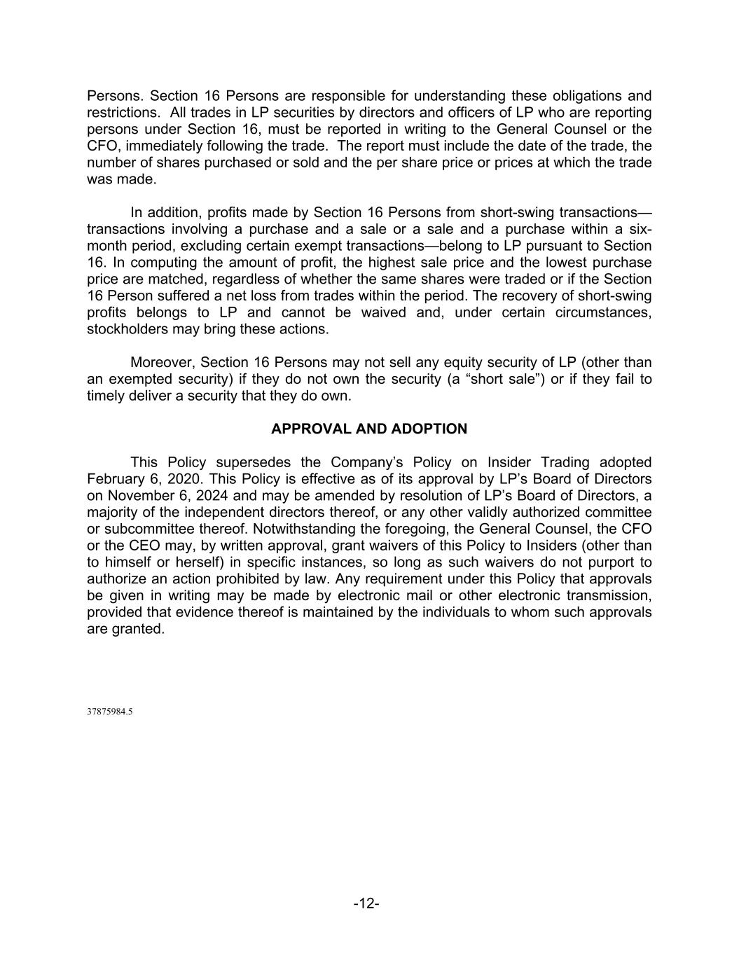 -12- Persons. Section 16 Persons are responsible for understanding these obligations and restrictions. All trades in LP securities by directors and officers of LP who are reporting persons under Section 16, must be reported in writing to the General Counsel or the CFO, immediately following the trade. The report must include the date of the trade, the number of shares purchased or sold and the per share price or prices at which the trade was made. In addition, profits made by Section 16 Persons from short-swing transactions— transactions involving a purchase and a sale or a sale and a purchase within a six- month period, excluding certain exempt transactions—belong to LP pursuant to Section 16. In computing the amount of profit, the highest sale price and the lowest purchase price are matched, regardless of whether the same shares were traded or if the Section 16 Person suffered a net loss from trades within the period. The recovery of short-swing profits belongs to LP and cannot be waived and, under certain circumstances, stockholders may bring these actions. Moreover, Section 16 Persons may not sell any equity security of LP (other than an exempted security) if they do not own the security (a “short sale”) or if they fail to timely deliver a security that they do own. APPROVAL AND ADOPTION This Policy supersedes the Company’s Policy on Insider Trading adopted February 6, 2020. This Policy is effective as of its approval by LP’s Board of Directors on November 6, 2024 and may be amended by resolution of LP’s Board of Directors, a majority of the independent directors thereof, or any other validly authorized committee or subcommittee thereof. Notwithstanding the foregoing, the General Counsel, the CFO or the CEO may, by written approval, grant waivers of this Policy to Insiders (other than to himself or herself) in specific instances, so long as such waivers do not purport to authorize an action prohibited by law. Any requirement under this Policy that approvals be given in writing may be made by electronic mail or other electronic transmission, provided that evidence thereof is maintained by the individuals to whom such approvals are granted. 37875984.5