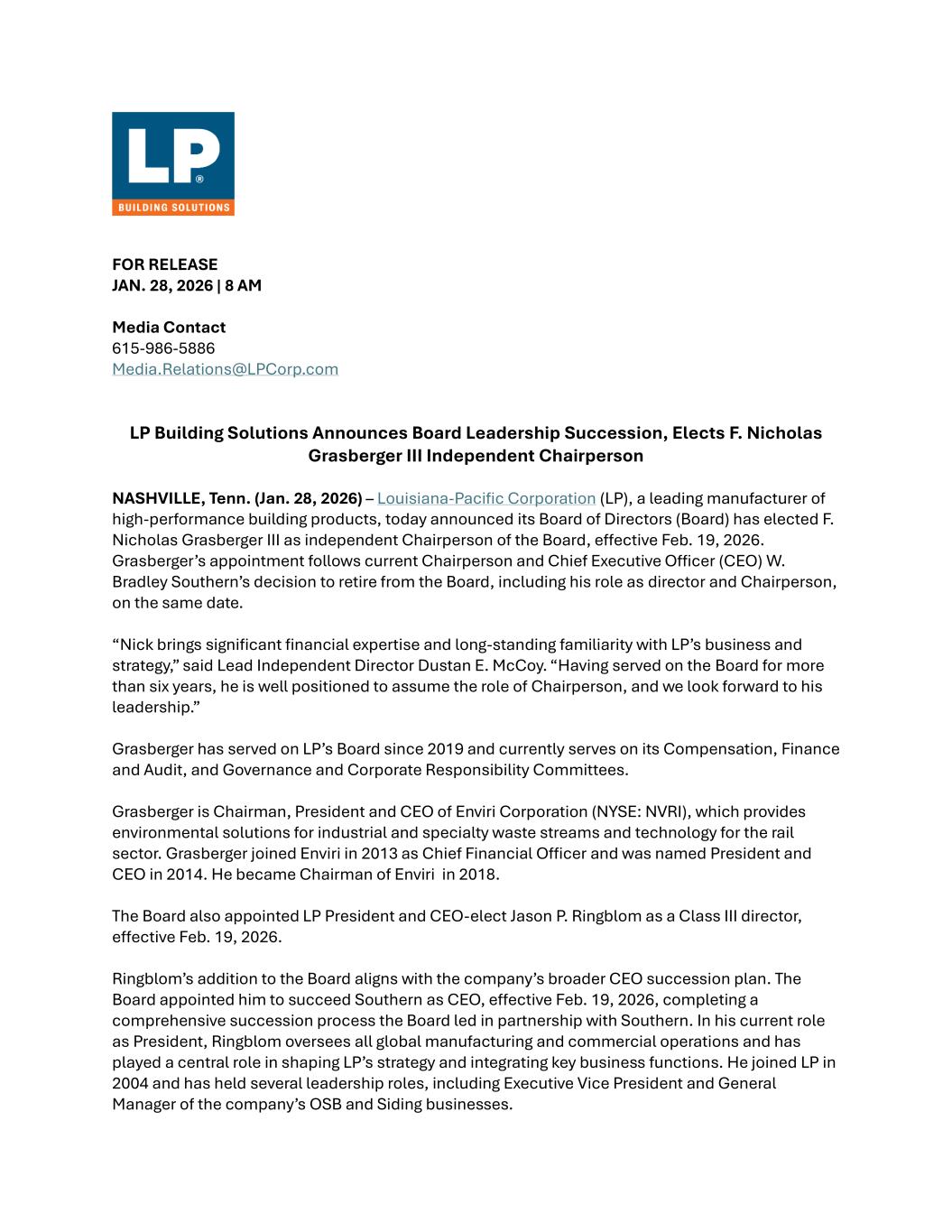 FOR RELEASE JAN. 28, 2026 | 8 AM Media Contact 615-986-5886 Media.Relations@LPCorp.com LP Building Solutions Announces Board Leadership Succession, Elects F. Nicholas Grasberger III Independent Chairperson NASHVILLE, Tenn. (Jan. 28, 2026) – Louisiana-Pacific Corporation (LP), a leading manufacturer of high-performance building products, today announced its Board of Directors (Board) has elected F. Nicholas Grasberger III as independent Chairperson of the Board, effective Feb. 19, 2026. Grasberger’s appointment follows current Chairperson and Chief Executive Officer (CEO) W. Bradley Southern’s decision to retire from the Board, including his role as director and Chairperson, on the same date. “Nick brings significant financial expertise and long-standing familiarity with LP’s business and strategy,” said Lead Independent Director Dustan E. McCoy. “Having served on the Board for more than six years, he is well positioned to assume the role of Chairperson, and we look forward to his leadership.” Grasberger has served on LP’s Board since 2019 and currently serves on its Compensation, Finance and Audit, and Governance and Corporate Responsibility Committees. Grasberger is Chairman, President and CEO of Enviri Corporation (NYSE: NVRI), which provides environmental solutions for industrial and specialty waste streams and technology for the rail sector. Grasberger joined Enviri in 2013 as Chief Financial Officer and was named President and CEO in 2014. He became Chairman of Enviri in 2018. The Board also appointed LP President and CEO-elect Jason P. Ringblom as a Class III director, effective Feb. 19, 2026. Ringblom’s addition to the Board aligns with the company’s broader CEO succession plan. The Board appointed him to succeed Southern as CEO, effective Feb. 19, 2026, completing a comprehensive succession process the Board led in partnership with Southern. In his current role as President, Ringblom oversees all global manufacturing and commercial operations and has played a central role in shaping LP’s strategy and integrating key business functions. He joined LP in 2004 and has held several leadership roles, including Executive Vice President and General Manager of the company’s OSB and Siding businesses.