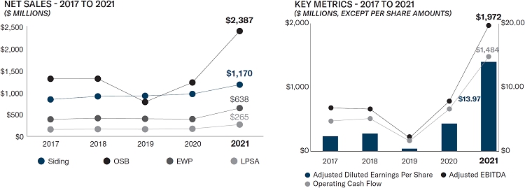 “2021 was a record year for LP Building Solutions. Our sustainable business model helped employees overcome the ongoing challenges of the COVID-19 pandemic and significant supply chain disruptions to meet robust demand for new residential construction and repair and remodeling. The result was all-time high revenue and EBITDA for all LP segments.”