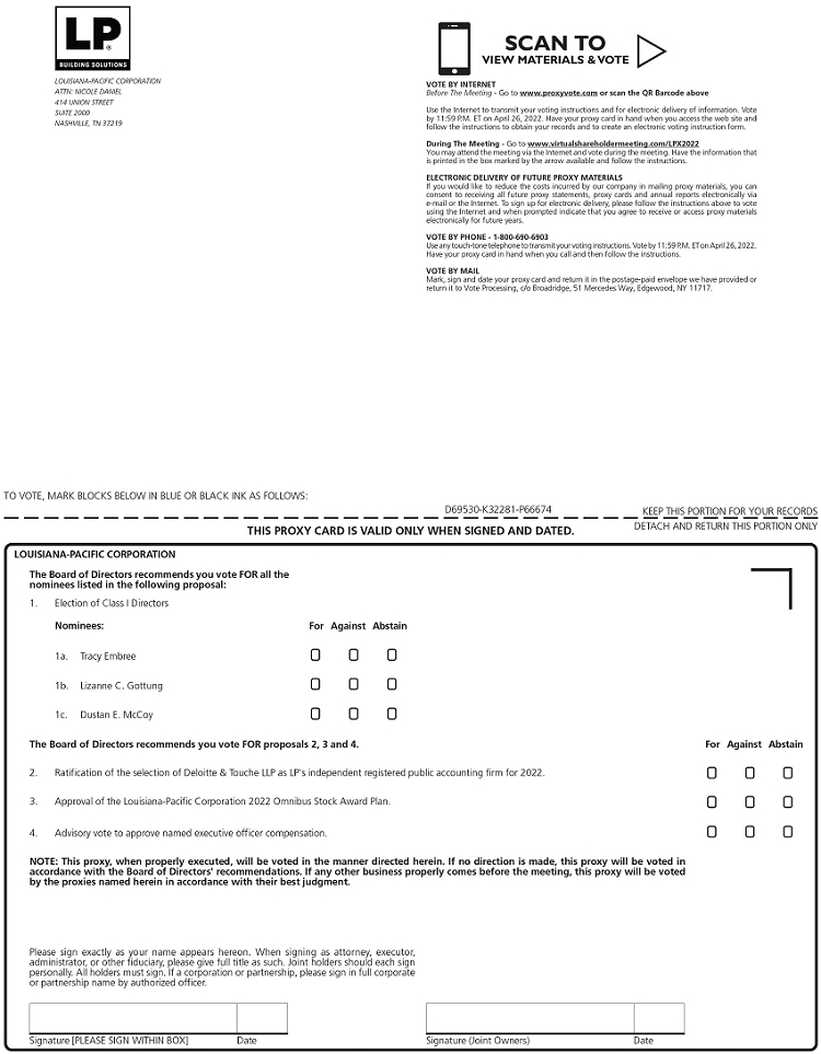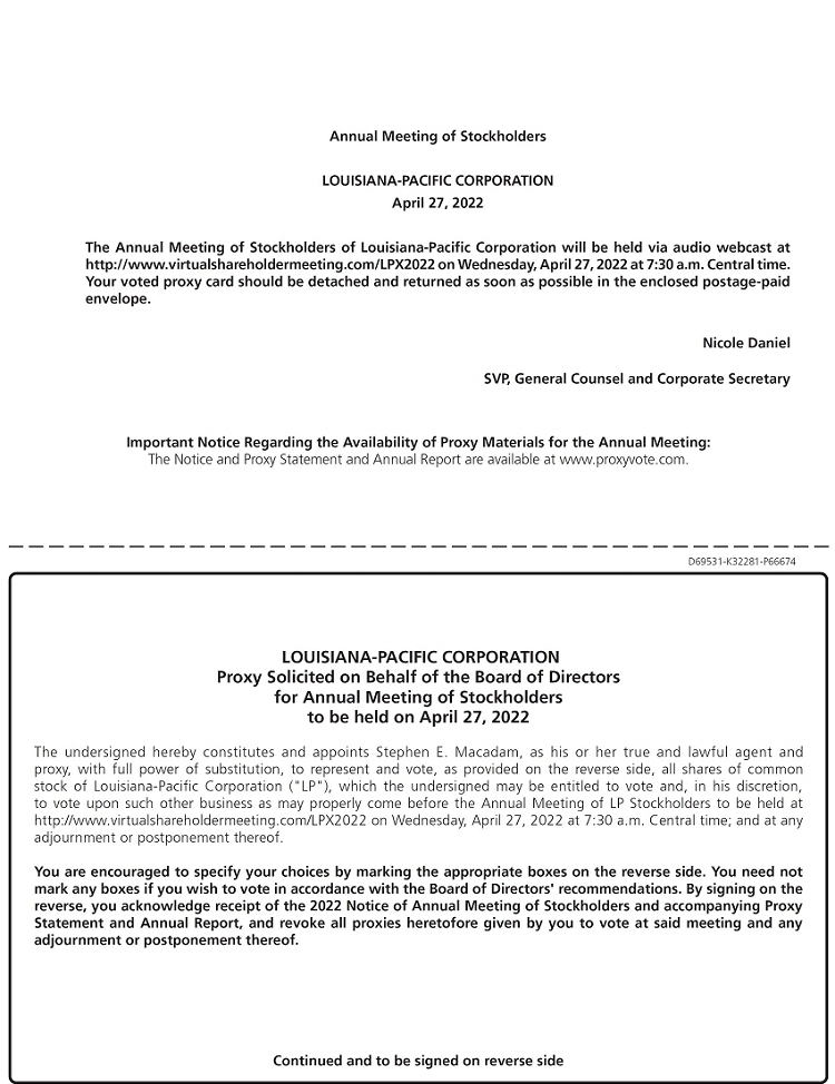 On behalf of the Board of Directors of Louisiana-Pacific Corporation (“LP”), thank you for your investment and continued confidence in LP. I cordially invite you to attend our 2022 Annual Meeting of Stockholders. In light of public health and safety concerns regarding the continuing coronavirus (“COVID-19”) pandemic and related restrictions, this year’s Annual Meeting of Stockholders will be held virtually via live audio webcast at http:// www.virtualshareholdermeeting.com/LPX2022 on April 27, 2022 at 7:30 a.m. Central Time.