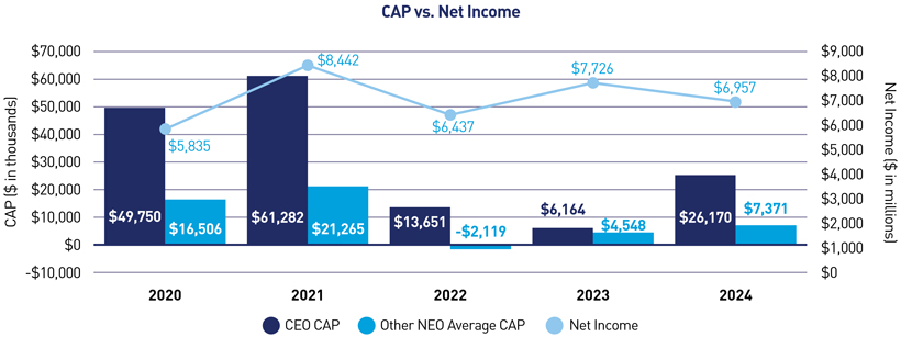 Our compensation mix is heavily performance-based with 73% of the CEO’s and 68% of the other named executive officers’ (“NEOs”) average annualized target compensation at-risk and contingent upon the achievement of performance objectives or relative and absolute share price performance. Additionally, 77% of the CEO’s and 71% of the other NEOs’ average compensation is in the form of long-term incentives.
