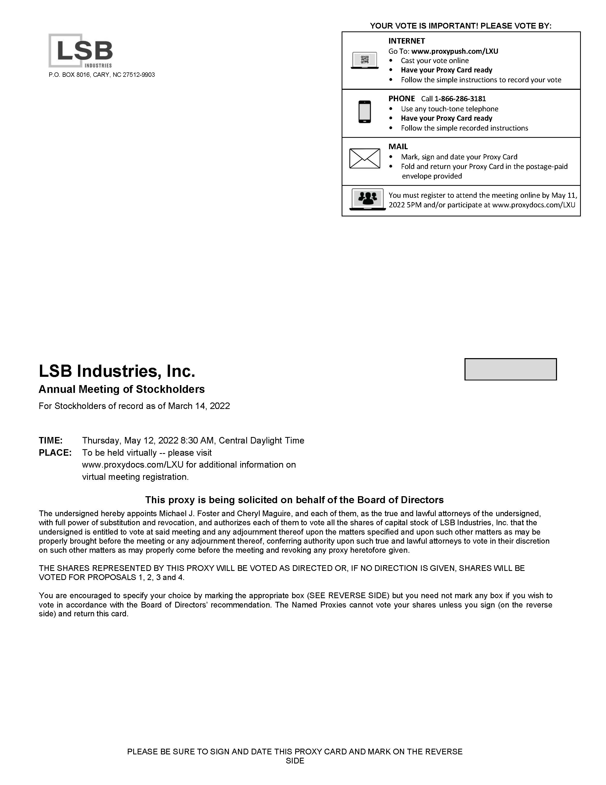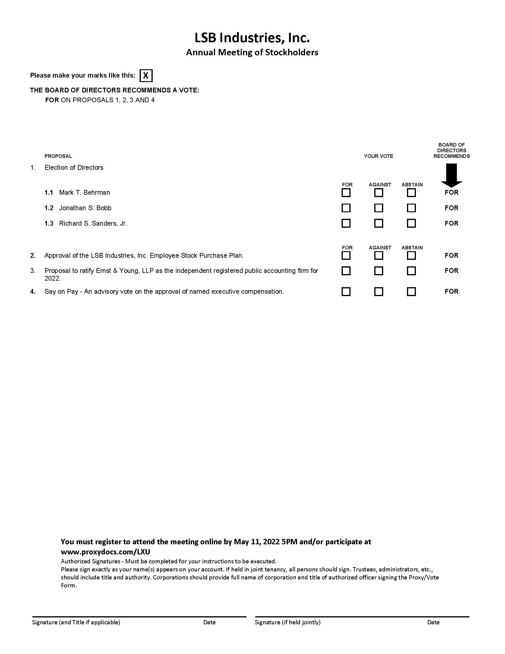 The 2022 Annual Meeting of the Stockholders of LSB Industries, Inc. (the “Company”) will be held in a virtual only format. You will not be able to attend the annual meeting in person. Registration is required online at www.proxydocs.com/LXU. The purpose of the Annual Meeting of Stockholders is the consideration and voting: