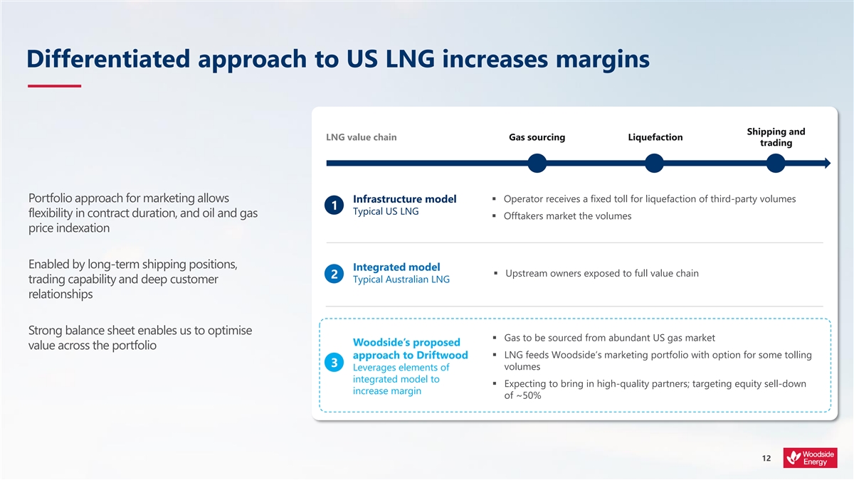 Leveraging Woodside’s LNG expertise to unlock Driftwood LNG Operational excellence Project track record Marketing capability Demonstrated capability in LNG plant Strong reputation as a reliable energy 35 years of LNG operations development supplier World-class reliability Long-term relationships with Bechtel Long-term relationships with and other key contractors (e.g. Baker customers Proven ability to increase plant Hughes) capacity through de-bottlenecking Experienced marketing and trading Strong project management capabilities teams with global relationships 11