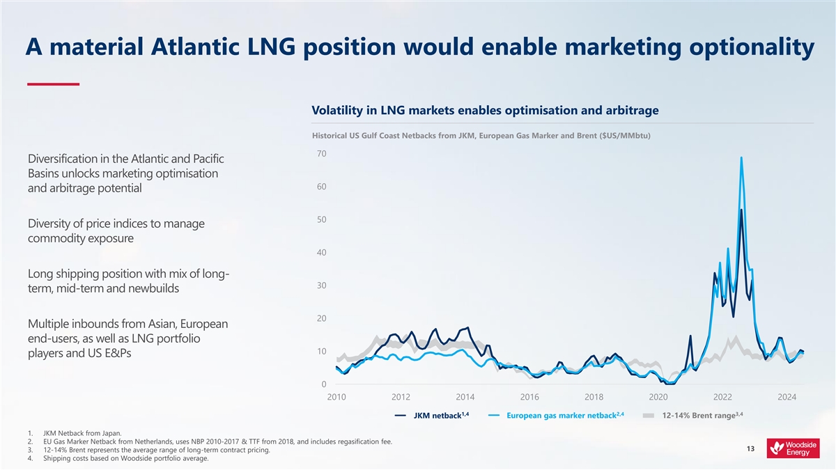 Differentiated approach to US LNG increases margins Shipping and LNG value chain Gas sourcing Liquefaction trading Portfolio approach for marketing allows Infrastructure model▪ Operator receives a fixed toll for liquefaction of third-party volumes 1 Typical US LNG flexibility in contract duration, and oil and gas ▪ Offtakers market the volumes price indexation Enabled by long-term shipping positions, Integrated model ▪ Upstream owners exposed to full value chain 2 Typical Australian LNG trading capability and deep customer relationships Strong balance sheet enables us to optimise ▪ Gas to be sourced from abundant US gas market Woodside’s proposed value across the portfolio ▪ LNG feeds Woodside’s marketing portfolio with option for some tolling approach to Driftwood 3 volumes Leverages elements of integrated model to ▪ Expecting to bring in high-quality partners; targeting equity sell-down increase margin of ~50% 12