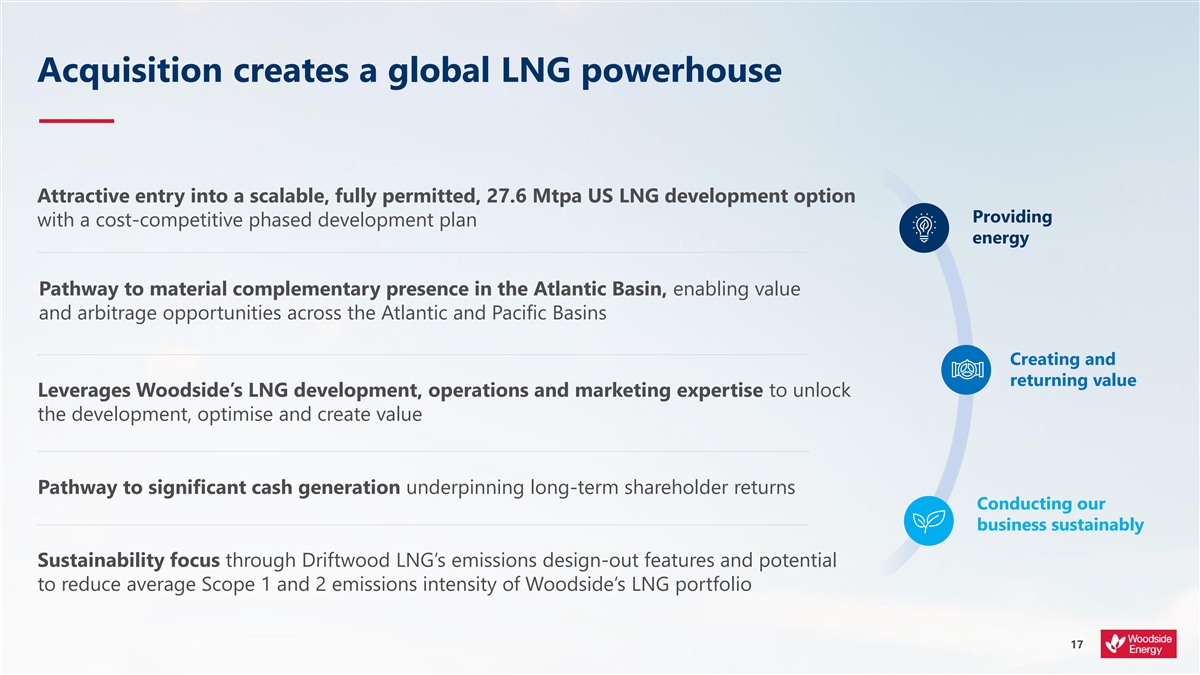 The acquisition of Tellurian and its Driftwood LNG development opportunity strengthens Woodside’s positioning to deliver on our strategy to thrive through the energy transition. The expected benefits of the acquisition include: