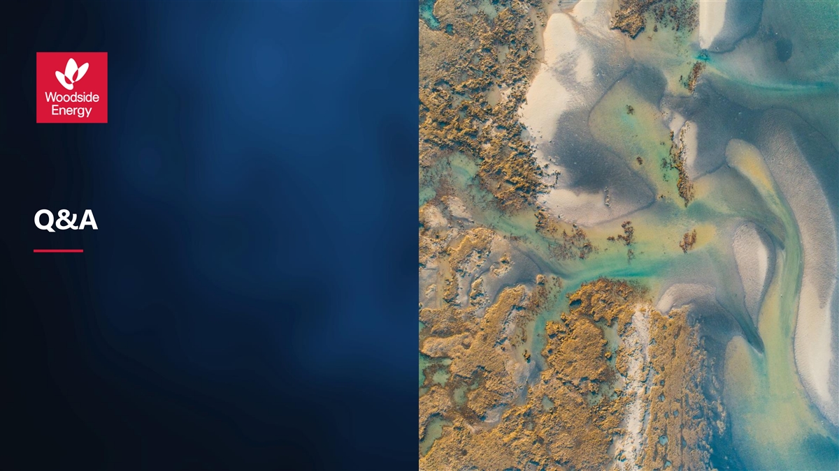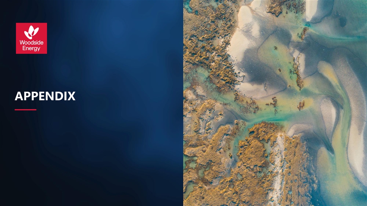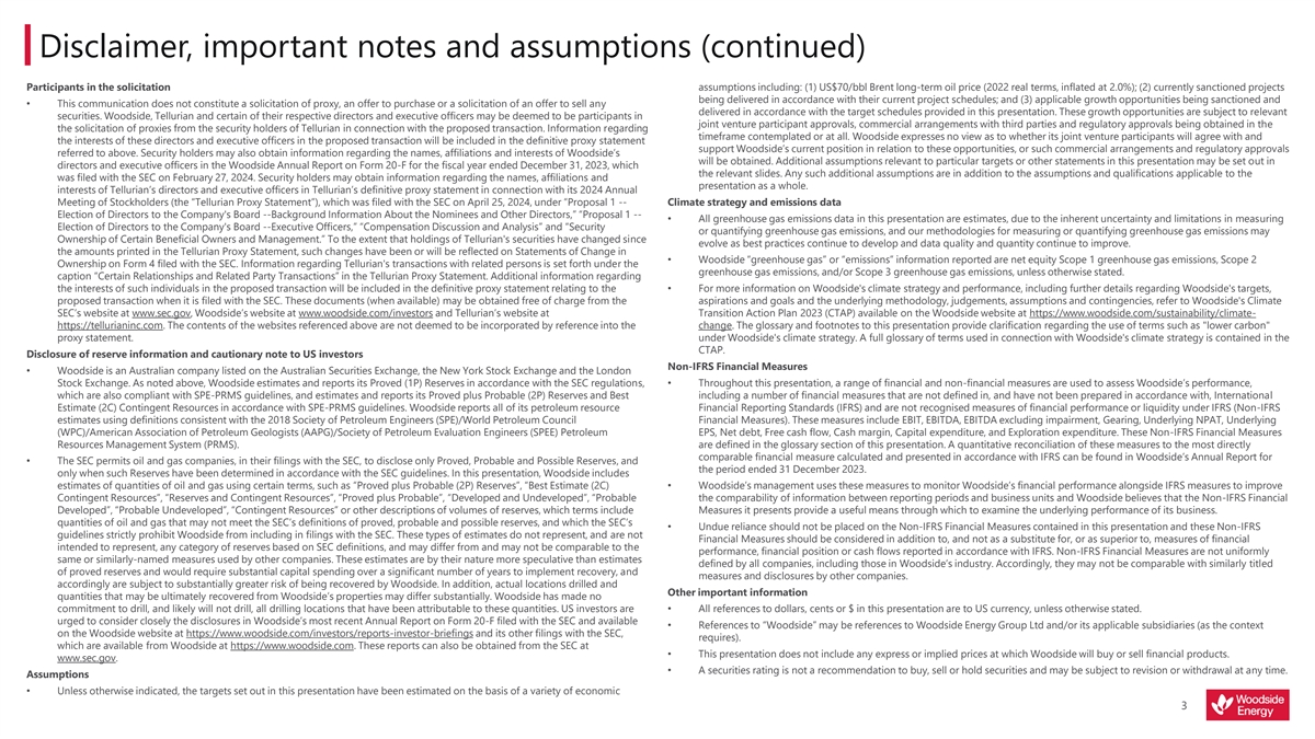 Disclaimer, important notes and assumptions (continued) Participants in the solicitation assumptions including: (1) US$70/bbl Brent long-term oil price (2022 real terms, inflated at 2.0%); (2) currently sanctioned projects being delivered in accordance with their current project schedules; and (3) applicable growth opportunities being sanctioned and • This communication does not constitute a solicitation of proxy, an offer to purchase or a solicitation of an offer to sell any delivered in accordance with the target schedules provided in this presentation. These growth opportunities are subject to relevant securities. Woodside, Tellurian and certain of their respective directors and executive officers may be deemed to be participants in joint venture participant approvals, commercial arrangements with third parties and regulatory approvals being obtained in the the solicitation of proxies from the security holders of Tellurian in connection with the proposed transaction. Information regarding timeframe contemplated or at all. Woodside expresses no view as to whether its joint venture participants will agree with and the interests of these directors and executive officers in the proposed transaction will be included in the definitive proxy statement support Woodside’s current position in relation to these opportunities, or such commercial arrangements and regulatory approvals referred to above. Security holders may also obtain information regarding the names, affiliations and interests of Woodside’s will be obtained. Additional assumptions relevant to particular targets or other statements in this presentation may be set out in directors and executive officers in the Woodside Annual Report on Form 20-F for the fiscal year ended December 31, 2023, which the relevant slides. Any such additional assumptions are in addition to the assumptions and qualifications applicable to the was filed with the SEC on February 27, 2024. Security holders may obtain information regarding the names, affiliations and presentation as a whole. interests of Tellurian’s directors and executive officers in Tellurian’s definitive proxy statement in connection with its 2024 Annual Meeting of Stockholders (the “Tellurian Proxy Statement”), which was filed with the SEC on April 25, 2024, under “Proposal 1 -- Climate strategy and emissions data Election of Directors to the Company's Board --Background Information About the Nominees and Other Directors,” “Proposal 1 -- • All greenhouse gas emissions data in this presentation are estimates, due to the inherent uncertainty and limitations in measuring Election of Directors to the Company's Board --Executive Officers,” “Compensation Discussion and Analysis” and “Security or quantifying greenhouse gas emissions, and our methodologies for measuring or quantifying greenhouse gas emissions may Ownership of Certain Beneficial Owners and Management.” To the extent that holdings of Tellurian's securities have changed since evolve as best practices continue to develop and data quality and quantity continue to improve. the amounts printed in the Tellurian Proxy Statement, such changes have been or will be reflected on Statements of Change in • Woodside “greenhouse gas” or “emissions” information reported are net equity Scope 1 greenhouse gas emissions, Scope 2 Ownership on Form 4 filed with the SEC. Information regarding Tellurian's transactions with related persons is set forth under the greenhouse gas emissions, and/or Scope 3 greenhouse gas emissions, unless otherwise stated. caption “Certain Relationships and Related Party Transactions” in the Tellurian Proxy Statement. Additional information regarding the interests of such individuals in the proposed transaction will be included in the definitive proxy statement relating to the • For more information on Woodside's climate strategy and performance, including further details regarding Woodside's targets, proposed transaction when it is filed with the SEC. These documents (when available) may be obtained free of charge from the aspirations and goals and the underlying methodology, judgements, assumptions and contingencies, refer to Woodside's Climate SEC’s website at www.sec.gov, Woodside’s website at www.woodside.com/investors and Tellurian’s website at Transition Action Plan 2023 (CTAP) available on the Woodside website at https://www.woodside.com/sustainability/climate- https://tellurianinc.com. The contents of the websites referenced above are not deemed to be incorporated by reference into the change. The glossary and footnotes to this presentation provide clarification regarding the use of terms such as lower carbon proxy statement. under Woodside's climate strategy. A full glossary of terms used in connection with Woodside's climate strategy is contained in the CTAP. Disclosure of reserve information and cautionary note to US investors Non-IFRS Financial Measures • Woodside is an Australian company listed on the Australian Securities Exchange, the New York Stock Exchange and the London Stock Exchange. As noted above, Woodside estimates and reports its Proved (1P) Reserves in accordance with the SEC regulations, • Throughout this presentation, a range of financial and non-financial measures are used to assess Woodside’s performance, which are also compliant with SPE-PRMS guidelines, and estimates and reports its Proved plus Probable (2P) Reserves and Best including a number of financial measures that are not defined in, and have not been prepared in accordance with, International Estimate (2C) Contingent Resources in accordance with SPE-PRMS guidelines. Woodside reports all of its petroleum resource Financial Reporting Standards (IFRS) and are not recognised measures of financial performance or liquidity under IFRS (Non-IFRS estimates using definitions consistent with the 2018 Society of Petroleum Engineers (SPE)/World Petroleum Council Financial Measures). These mea