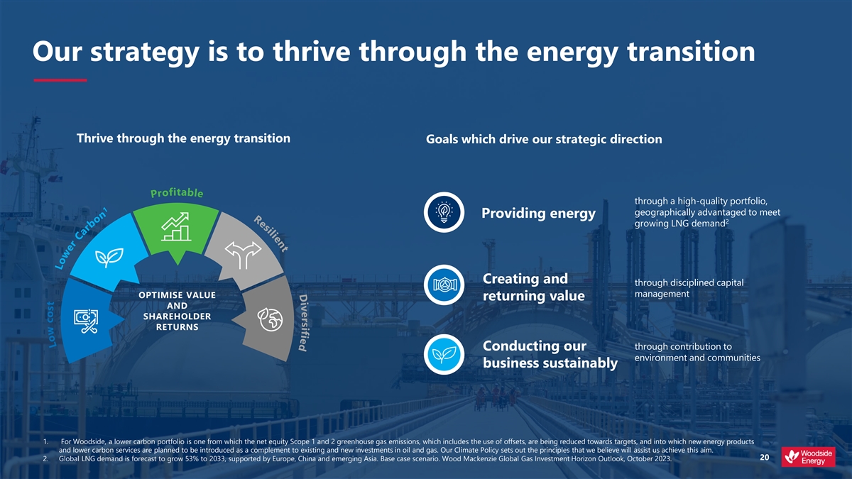 d e i f i s r e v i D t n e i l i s e R e l b a t Our strategy is to thrive through the energy transition Thrive through the energy transition Goals which drive our strategic direction through a high-quality portfolio, geographically advantaged to meet Providing energy 2 growing LNG demand Creating and through disciplined capital management OPTIMISE VALUE returning value AND SHAREHOLDER RETURNS through contribution to Conducting our environment and communities business sustainably 1. For Woodside, a lower carbon portfolio is one from which the net equity Scope 1 and 2 greenhouse gas emissions, which includes the use of offsets, are being reduced towards targets, and into which new energy products and lower carbon services are planned to be introduced as a complement to existing and new investments in oil and gas. Our Climate Policy sets out the principles that we believe will assist us achieve this aim. 20 2. Global LNG demand is forecast to grow 53% to 2033, supported by Europe, China and emerging Asia. Base case scenario. Wood Mackenzie Global Gas Investment Horizon Outlook, October 2023. i f o r P 1 n o b r a C r e w o L t s o c w o L