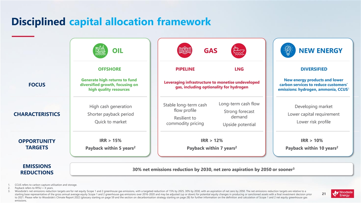 Disciplined capital allocation framework OIL GAS NEW ENERGY OFFSHORE PIPELINE LNG DIVERSIFIED Generate high returns to fund New energy products and lower Leveraging infrastructure to monetise undeveloped diversified growth, focusing on carbon services to reduce customers’ FOCUS gas, including optionality for hydrogen 1 high quality resources emissions: hydrogen, ammonia, CCUS Long-term cash flow Stable long-term cash High cash generation Developing market flow profile Strong forecast Shorter payback period Lower capital requirement CHARACTERISTICS demand Resilient to Quick to market Lower risk profile commodity pricing Upside potential IRR > 15% IRR > 12% IRR > 10% OPPORTUNITY 2 2 2 TARGETS Payback within 5 years Payback within 7 years Payback within 10 years EMISSIONS 3 30% net emissions reduction by 2030, net zero aspiration by 2050 or sooner REDUCTIONS 1. CCUS refers to carbon capture utilisation and storage. 2. Payback refers to RFSU + X years. 3. Woodside’s net emissions reduction targets are for net equity Scope 1 and 2 greenhouse gas emissions, with a targeted reduction of 15% by 2025, 30% by 2030, with an aspiration of net zero by 2050. The net emissions reduction targets are relative to a starting base representative of the gross annual average equity Scope 1 and 2 greenhouse gas emissions over 2016-2020 and may be adjusted (up or down) for potential equity changes in producing or sanctioned assets with a final investment decision prior 21 to 2021. Please refer to Woodside’s Climate Report 2022 (glossary starting on page 59 and the section on decarbonisation strategy starting on page 28) for further information on the definition and calculation of Scope 1 and 2 net equity greenhouse gas emissions.