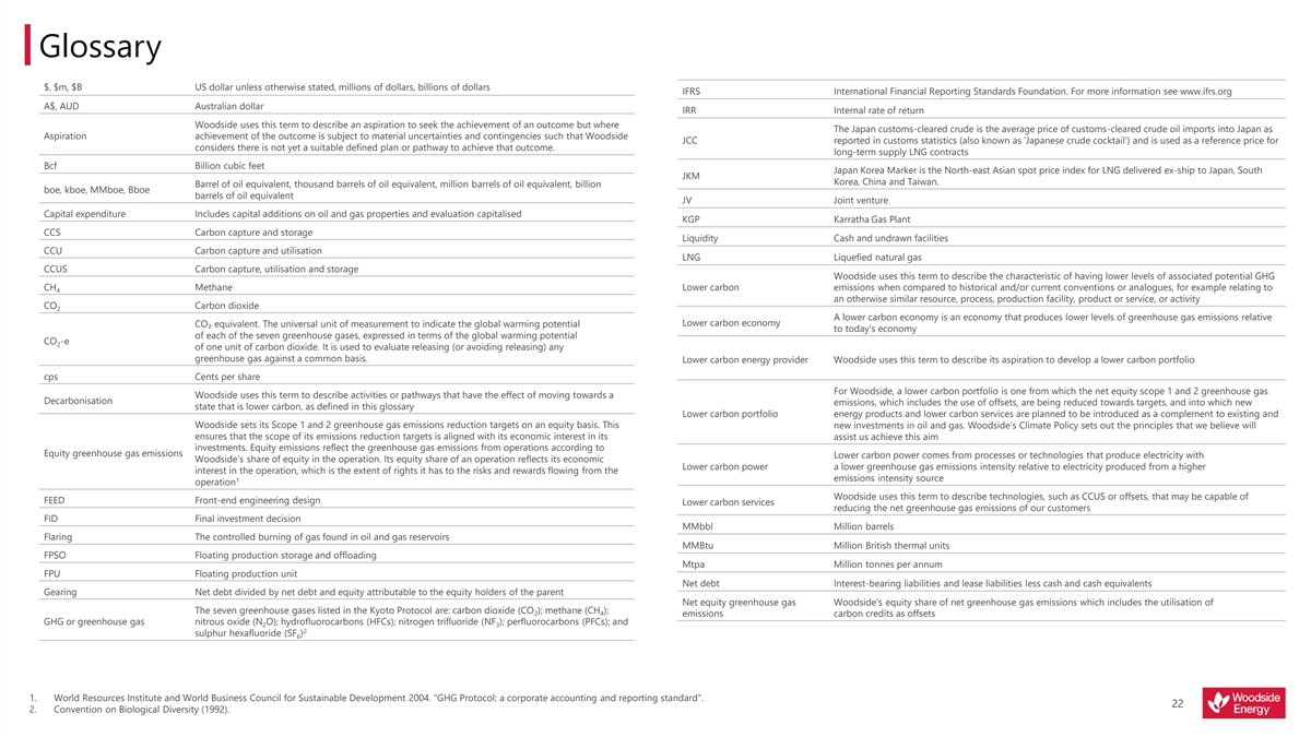Glossary $, $m, $B US dollar unless otherwise stated, millions of dollars, billions of dollars IFRS International Financial Reporting Standards Foundation. For more information see www.ifrs.org A$, AUD Australian dollar IRR Internal rate of return Woodside uses this term to describe an aspiration to seek the achievement of an outcome but where The Japan customs-cleared crude is the average price of customs-cleared crude oil imports into Japan as Aspiration achievement of the outcome is subject to material uncertainties and contingencies such that Woodside JCC reported in customs statistics (also known as ‘Japanese crude cocktail’) and is used as a reference price for considers there is not yet a suitable defined plan or pathway to achieve that outcome. long-term supply LNG contracts Bcf Billion cubic feet Japan Korea Marker is the North-east Asian spot price index for LNG delivered ex-ship to Japan, South JKM Korea, China and Taiwan. Barrel of oil equivalent, thousand barrels of oil equivalent, million barrels of oil equivalent, billion boe, kboe, MMboe, Bboe barrels of oil equivalent JV Joint venture Capital expenditure Includes capital additions on oil and gas properties and evaluation capitalised KGP Karratha Gas Plant CCS Carbon capture and storage Liquidity Cash and undrawn facilities CCU Carbon capture and utilisation LNG Liquefied natural gas CCUS Carbon capture, utilisation and storage Woodside uses this term to describe the characteristic of having lower levels of associated potential GHG CH Methane Lower carbon emissions when compared to historical and/or current conventions or analogues, for example relating to 4 an otherwise similar resource, process, production facility, product or service, or activity CO Carbon dioxide 2 A lower carbon economy is an economy that produces lower levels of greenhouse gas emissions relative Lower carbon economy CO₂ equivalent. The universal unit of measurement to indicate the global warming potential to today’s economy of each of the seven greenhouse gases, expressed in terms of the global warming potential CO -e 2 of one unit of carbon dioxide. It is used to evaluate releasing (or avoiding releasing) any greenhouse gas against a common basis. Lower carbon energy provider Woodside uses this term to describe its aspiration to develop a lower carbon portfolio cps Cents per share For Woodside, a lower carbon portfolio is one from which the net equity scope 1 and 2 greenhouse gas Woodside uses this term to describe activities or pathways that have the effect of moving towards a Decarbonisation emissions, which includes the use of offsets, are being reduced towards targets, and into which new state that is lower carbon, as defined in this glossary Lower carbon portfolio energy products and lower carbon services are planned to be introduced as a complement to existing and Woodside sets its Scope 1 and 2 greenhouse gas emissions reduction targets on an equity basis. This new investments in oil and gas. Woodside’s Climate Policy sets out the principles that we believe will ensures that the scope of its emissions reduction targets is aligned with its economic interest in its assist us achieve this aim investments. Equity emissions reflect the greenhouse gas emissions from operations according to Equity greenhouse gas emissions Lower carbon power comes from processes or technologies that produce electricity with Woodside’s share of equity in the operation. Its equity share of an operation reflects its economic Lower carbon power a lower greenhouse gas emissions intensity relative to electricity produced from a higher interest in the operation, which is the extent of rights it has to the risks and rewards flowing from the emissions intensity source 1 operation Woodside uses this term to describe technologies, such as CCUS or offsets, that may be capable of FEED Front-end engineering design Lower carbon services reducing the net greenhouse gas emissions of our customers FID Final investment decision MMbbl Million barrels Flaring The controlled burning of gas found in oil and gas reservoirs MMBtu Million British thermal units FPSO Floating production storage and offloading Mtpa Million tonnes per annum FPU Floating production unit Net debt Interest-bearing liabilities and lease liabilities less cash and cash equivalents Gearing Net debt divided by net debt and equity attributable to the equity holders of the parent Net equity greenhouse gas Woodside’s equity share of net greenhouse gas emissions which includes the utilisation of The seven greenhouse gases listed in the Kyoto Protocol are: carbon dioxide (CO ); methane (CH ); 2 4 emissions carbon credits as offsets GHG or greenhouse gas nitrous oxide (N O); hydrofluorocarbons (HFCs); nitrogen trifluoride (NF ); perfluorocarbons (PFCs); and 2 3 2 sulphur hexafluoride (SF ) 6 1. World Resources Institute and World Business Council for Sustainable Development 2004. “GHG Protocol: a corporate accounting and reporting standard”. 22 2. Convention on Biological Diversity (1992).