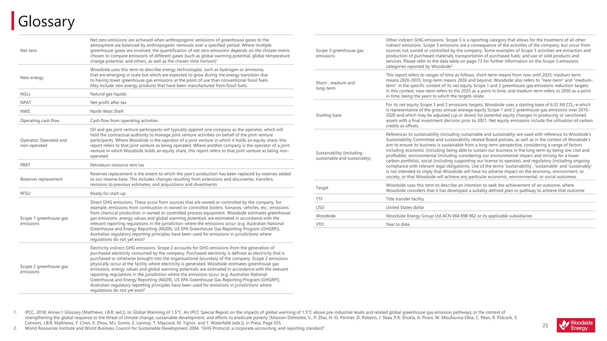 | 2 | Woodside’s net emissions reduction targets are for net equity Scope 1 and 2 greenhouse gas emissions, with a targeted reduction of 15% by 2025, 30% by 2030, with an aspiration of net zero by 2050. The net emissions reduction targets are relative to a starting base representative of the gross annual average equity Scope 1 and 2 greenhouse gas emissions over 2016-2020 and may be adjusted (up or down) for potential equity changes in producing or sanctioned assets with a final investment decision prior to 2021. |