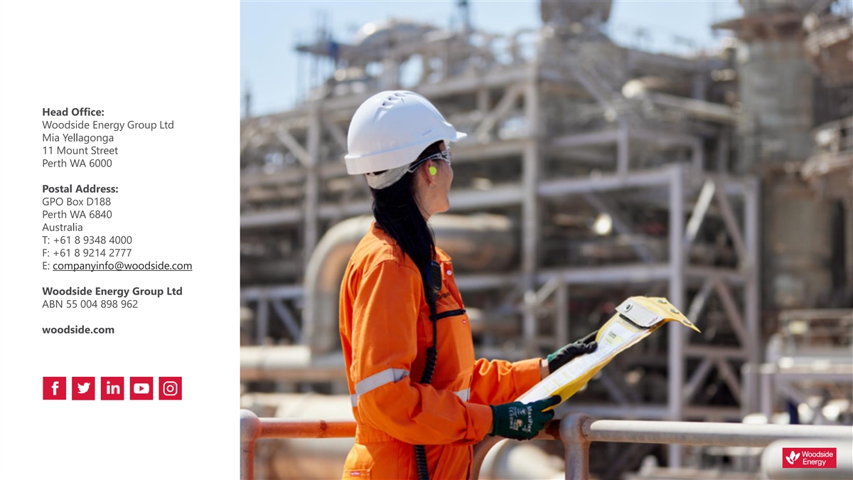 Head Office: Woodside Energy Group Ltd Mia Yellagonga 11 Mount Street Perth WA 6000 Postal Address: GPO Box D188 Perth WA 6840 Australia T: +61 8 9348 4000 F: +61 8 9214 2777 E: companyinfo@woodside.com Woodside Energy Group Ltd ABN 55 004 898 962 woodside.com