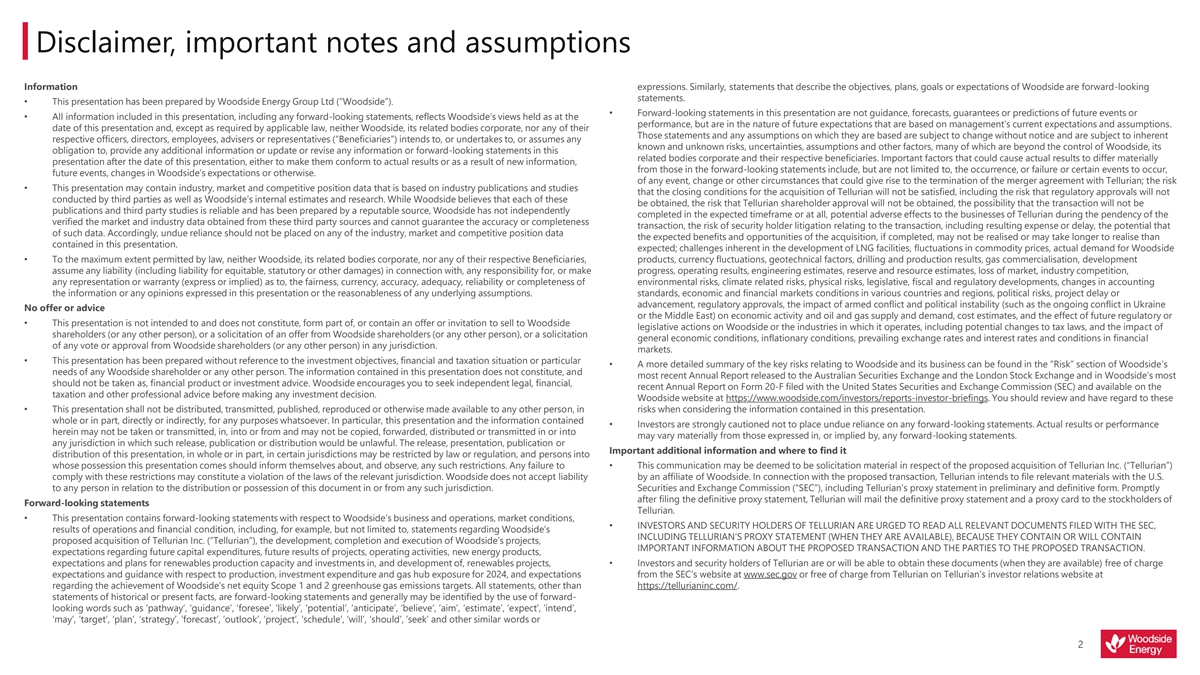 Forward-looking statements in this communication are not guidance, forecasts, guarantees or predictions of future events or performance, but are in the nature of future expectations that are based on management’s current expectations and assumptions. Those statements and any assumptions on which they are based are subject to change without notice and are subject to inherent known and unknown risks, uncertainties, assumptions and other factors, many of which are beyond the control of Woodside, its related bodies corporate and their respective Beneficiaries. Important factors that could cause actual results to differ materially from those in the forward-looking statements include, but are not limited to, the occurrence, or failure or certain events to occur, of any event, change or other circumstances that could give rise to the termination of the merger agreement with Tellurian; the risk that the closing conditions for the acquisition of Tellurian will not be satisfied, including the risk that regulatory approvals will not be obtained, the risk that Tellurian shareholder approval will not be obtained, the possibility that the transaction will not be completed in the expected timeframe or at all, potential adverse effects to the businesses of Tellurian during the pendency of the transaction, the risk of security holder litigation relating to the transaction, including resulting expense or delay, the potential that the expected benefits and opportunities of the acquisition, if completed, may not be realized or may take longer to realize than expected; challenges inherent in the development of LNG facilities, fluctuations in commodity prices, actual demand for Woodside products, currency fluctuations, geotechnical factors, drilling and production results, gas commercialisation, development progress, operating results, engineering estimates, reserve and resource estimates, loss of market, industry competition, environmental risks, climate related risks, physical risks, legislative, fiscal and regulatory developments, changes in accounting standards, economic and financial markets conditions in various countries and regions, political risks, project delay or advancement, regulatory approvals, the impact of armed conflict and political instability (such as the ongoing conflict in Ukraine or the Middle East) on economic activity and oil and gas supply and demand, cost estimates, and the effect of future regulatory or legislative actions on Woodside or the industries in which it operates, including potential changes to tax laws, and the impact of general economic conditions, inflationary conditions, prevailing exchange rates and interest rates and conditions in financial markets.