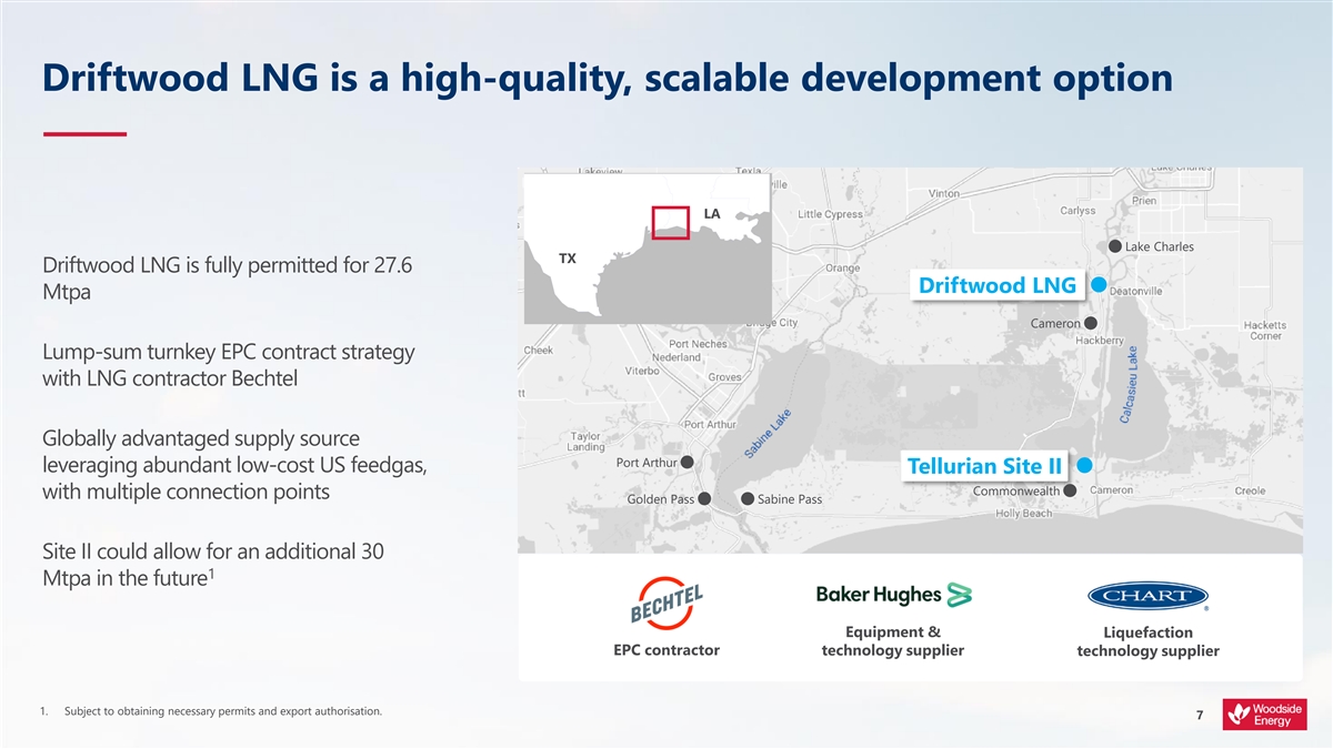 Increases LNG portfolio and geographical diversification Atlantic LNG Pacific LNG Stage / equity interest Stage / capacity (100%) Operated Operated NWS Project Producing 5.6 Mtpa Driftwood LNG Pre-FID 16.5 Mtpa (Phase 1 and 2) Pluto LNG Producing 4.4 Mtpa Driftwood LNG Scarborough Pre-FID 11.1 Mtpa Under (Phase 3 and 4) Corpus Christi 3 (targeting first 6.0 Mtpa Driftwood LNG construction Mexico LNG 2026) Commonwealth LNG Pacific Merchant Stage / offtake amount Stage / equity interest Non-operated 1 Calypso Corpus Christi Producing 0.85 Mtpa 4 Wheatstone Producing 1.2 Mtpa Sunrise Commonwealth Pre-FID 2.5 Mtpa Browse 2 LNG North West Shelf Stage / offtake amount Scarborough Merchant Pluto LNG 5 Wheatstone Mexico Pacific Pre-FID 1.3 Mtpa Future growth Calypso Future growth Browse Operating Sunrise Under construction/not sanctioned Improves positioning with buyers and enables further marketing optimisation Expands high-quality LNG asset base 1. Refer to announcement titled ‘Corpus Christi Liquefaction LLC conditions satisfied’, released 14 May 2015. 2. Refer to media announcement titled ‘Commonwealth LNG signs agreements with Woodside’, released 5 September 2022. 3. Includes up to 3 Mtpa (gross), 2.25 Mtpa (equity interest) processed through Pluto Train 1. 4. Woodside’s 13% non-operated interest in the Wheatstone Project includes the offshore platform, the pipeline to shore and the onshore plant, but excludes the Wheatstone and Iago fields and subsea infrastructure. Woodside also has a 65% interest in the Julimar Development Project. 6 5. Refer to announcement titled ‘Woodside and Mexico Pacific sign LNG supply agreement’, released 6 December 2023.