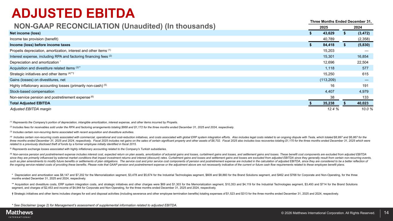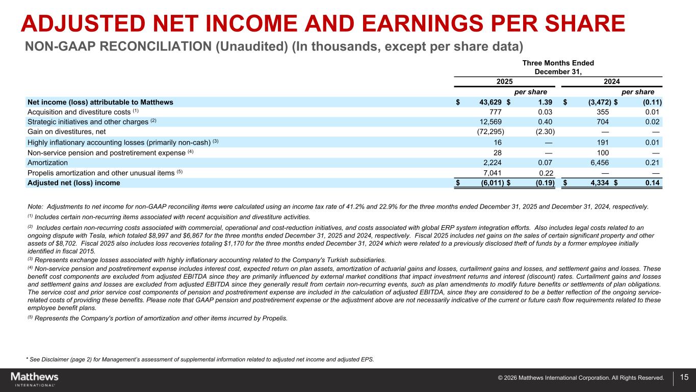 © 2026 Matthews International Corporation. All Rights Reserved. * See Disclaimer (page 2) for Management’s assessment of supplemental information related to adjusted EBITDA. 14 Three Months Ended December 31, 2025 2024 Net income (loss) $ 43,629 $ (3,472) Income tax provision (benefit) 40,789 (2,358) Income (loss) before income taxes $ 84,418 $ (5,830) Propelis depreciation, amortization, interest and other items (1) 15,203 — Interest expense, including RPA and factoring financing fees (2) 15,301 16,854 Depreciation and amortization * 12,696 22,504 Acquisition and divestiture related items (3)** 1,118 577 Strategic initiatives and other items (4)**† 15,250 615 Gains (losses) on divestitures, net (113,209) — Highly inflationary accounting losses (primarily non-cash) (5) 16 191 Stock-based compensation 4,407 4,979 Non-service pension and postretirement expense (6) 38 133 Total Adjusted EBITDA $ 35,238 $ 40,023 Adjusted EBITDA margin 12.4 % 10.0 % (1) Represents the Company's portion of depreciation, intangible amortization, interest expense, and other items incurred by Propelis. (2) Includes fees for receivables sold under the RPA and factoring arrangements totaling $668 and $1,172 for the three months ended December 31, 2025 and 2024, respectively. (3) Includes certain non-recurring items associated with recent acquisition and divestiture activities. (4) Includes certain non-recurring costs associated with commercial, operational and cost-reduction initiatives, and costs associated with global ERP system integration efforts. Also includes legal costs related to an ongoing dispute with Tesla, which totaled $8,997 and $6,867 for the three months ended December 31, 2025 and 2024, respectively. Fiscal 2025 includes net gains on the sales of certain significant property and other assets of $8,702. Fiscal 2025 also includes loss recoveries totaling $1,170 for the three months ended December 31, 2025 which were related to a previously disclosed theft of funds by a former employee initially identified in fiscal 2015. 5) Represents exchange losses associated with highly inflationary accounting related to the Company's Turkish subsidiaries. (6) Non-service pension and postretirement expense includes interest cost, expected return on plan assets, amortization of actuarial gains and losses, curtailment gains and losses, and settlement gains and losses. These benefit cost components are excluded from adjusted EBITDA since they are primarily influenced by external market conditions that impact investment returns and interest (discount) rates. Curtailment gains and losses and settlement gains and losses are excluded from adjusted EBITDA since they generally result from certain non-recurring events, such as plan amendments to modify future benefits or settlements of plan obligations. The service cost and prior service cost components of pension and postretirement expense are included in the calculation of adjusted EBITDA, since they are considered to be a better reflection of the ongoing service-related costs of providing these benefits. Please note that GAAP pension and postretirement expense or the adjustment above are not necessarily indicative of the current or future cash flow requirements related to these employee benefit plans. * Depreciation and amortization was $8,147 and $7,202 for the Memorialization segment, $3,478 and $5,674 for the Industrial Technologies segment, $609 and $8,860 for the Brand Solutions segment, and $462 and $768 for Corporate and Non-Operating, for the three months ended December 31, 2025 and 2024, respectively. ** Acquisition and divestiture costs, ERP system integration costs, and strategic initiatives and other charges were $69 and $1,303 for the Memorialization segment, $10,353 and $4,119 for the Industrial Technologies segment, $3,493 and $714 for the Brand Solutions segment, and charges of $2,453 and income of $4,944 for Corporate and Non-Operating, for the three months ended December 31, 2025 and 2024, respectively. † Strategic initiatives and other items includes charges for exit and disposal activities (including severance and other employee termination benefits) totaling expenses of $1,523 and $313 for the three months ended December 31, 2025 and 2024, respectively. ADJUSTED EBITDA NON-GAAP RECONCILIATION (Unaudited) (In thousands)