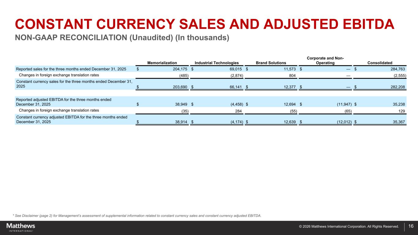 © 2026 Matthews International Corporation. All Rights Reserved. * See Disclaimer (page 2) for Management’s assessment of supplemental information related to constant currency sales and constant currency adjusted EBITDA. 16 CONSTANT CURRENCY SALES AND ADJUSTED EBITDA NON-GAAP RECONCILIATION (Unaudited) (In thousands) Memorialization Industrial Technologies Brand Solutions Corporate and Non- Operating Consolidated Reported sales for the three months ended December 31, 2025 $ 204,175 $ 69,015 $ 11,573 $ — $ 284,763 Changes in foreign exchange translation rates (485) (2,874) 804 — (2,555) Constant currency sales for the three months ended December 31, 2025 $ 203,690 $ 66,141 $ 12,377 $ — $ 282,208 Reported adjusted EBITDA for the three months ended December 31, 2025 $ 38,949 $ (4,458) $ 12,694 $ (11,947) $ 35,238 Changes in foreign exchange translation rates (35) 284 (55) (65) 129 Constant currency adjusted EBITDA for the three months ended December 31, 2025 $ 38,914 $ (4,174) $ 12,639 $ (12,012) $ 35,367