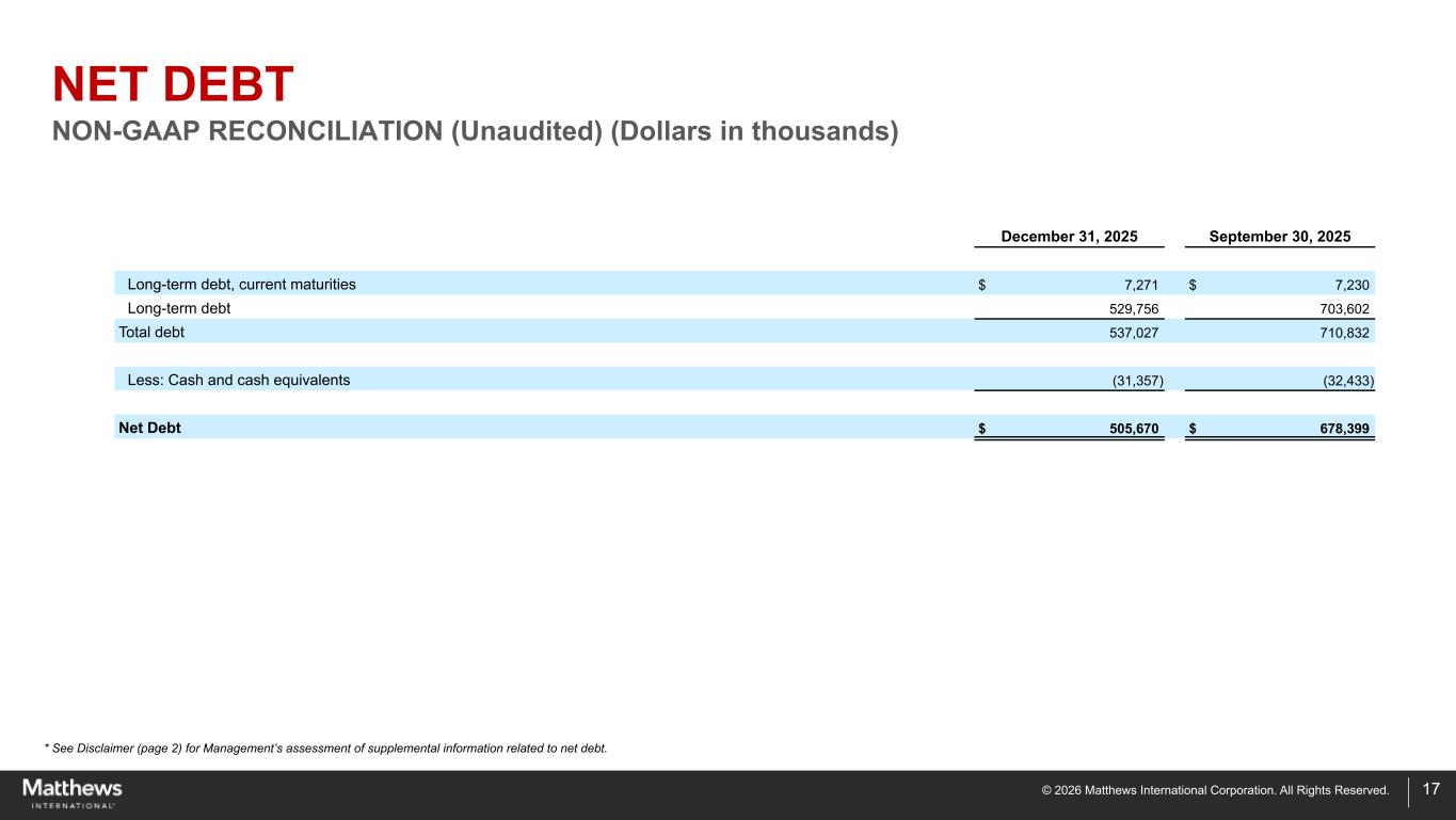 © 2026 Matthews International Corporation. All Rights Reserved. 13 Included in this report are measures of financial performance that are not defined by GAAP, including, without limitation, adjusted EBITDA, adjusted net income and EPS, constant currency sales, and constant currency adjusted EBITDA, and net debt. The Company uses non-GAAP financial measures to assist in comparing its performance on a consistent basis for purposes of business decision-making by removing the impact of certain items that management believes do not directly reflect the Company’s core operations including acquisition and divestiture costs, ERP system integration costs, strategic initiative and other charges (which includes non-recurring charges related to certain commercial and operational initiatives and exit activities), stock-based compensation and the non-service portion of pension and postretirement expense. Constant currency sales and constant currency adjusted EBITDA removes the impact of changes due to foreign exchange translation rates. To calculate sales and adjusted EBITDA on a constant currency basis, amounts for periods in the current fiscal year are translated into U.S. dollars using exchange rates applicable to the comparable periods of the prior fiscal year. Management believes that presenting non-GAAP financial measures is useful to investors because it (i) provides investors with meaningful supplemental information regarding financial performance by excluding certain items that management believes do not directly reflect the Company's core operations, (ii) permits investors to view performance using the same tools that management uses to budget, forecast, make operating and strategic decisions, and evaluate historical performance, and (iii) otherwise provides supplemental information that may be useful to investors in evaluating the Company’s results. The Company's calculations of its non-GAAP financial measures, however, may not be comparable to similarly titled measures reported by other companies. The Company believes that the presentation of these non-GAAP financial measures, when considered together with the corresponding GAAP financial measures and the reconciliations to those measures, provided herein, provide investors with an additional understanding of the factors and trends affecting the Company’s business that could not be obtained absent these disclosures. RECONCILIATIONS OF NON-GAAP FINANCIAL MEASURES