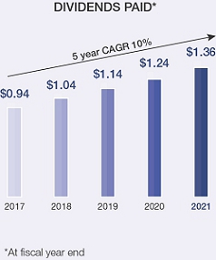 | 36 years of uninterrupted dividend increases | We have paid dividends every year since 1925 and have increased our dividend in each of the past 36 years, placing McCormick among the S&P 500’s Dividend Aristocrats. In 2021, our dividend paid reached $1.36 per share. At the end of 2021 our Board of Directors authorized a 9% increase in the quarterly dividend continuing our long history of returning cash to stockholders. |